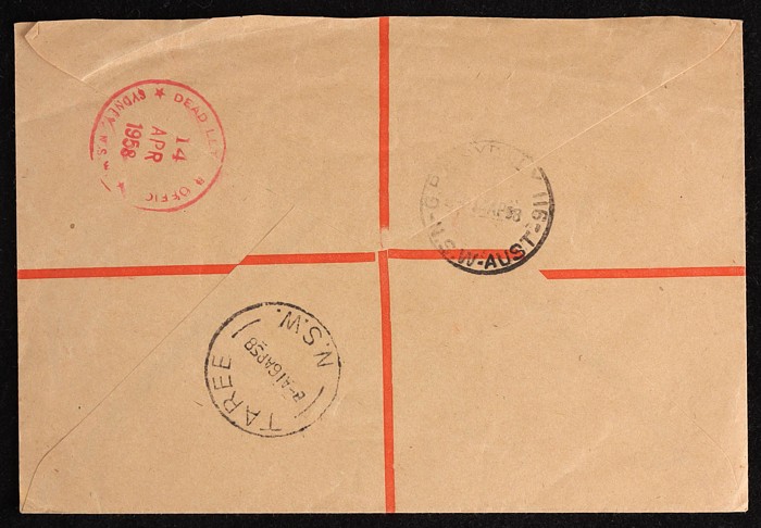Surcharged Letter' stampless cover to Taree NSW with 1958 'GPO Sydney Paid' cds in red, comp with contents being unpaid Postage Due cover (taxed at 8d) to Sydney GPO, with black REFUSED cachet at UL, or, plus red 'Dead Letter Office' circular cachet.