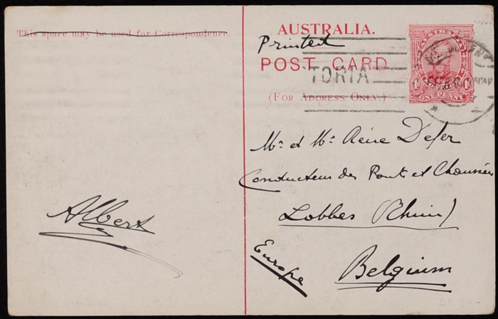 Scenic KGV 1d red, text setting 1, view 'Swanston St Melb' in black. VFU to Belgium at Printed Matter rate, ' Melbourne 6 FE 14' pmk. ACSC P21(7) cat $75. (Image1) (Image2)