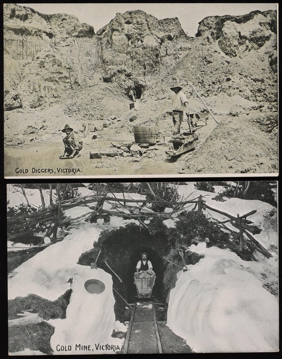 Scenic KGV 1d red (2 shades), text setting 1, views Gold Diggers & Gold Mine. Superb fresh UN. ACSC P21(9&11) cat $250. (2) (Image1) (Image2)