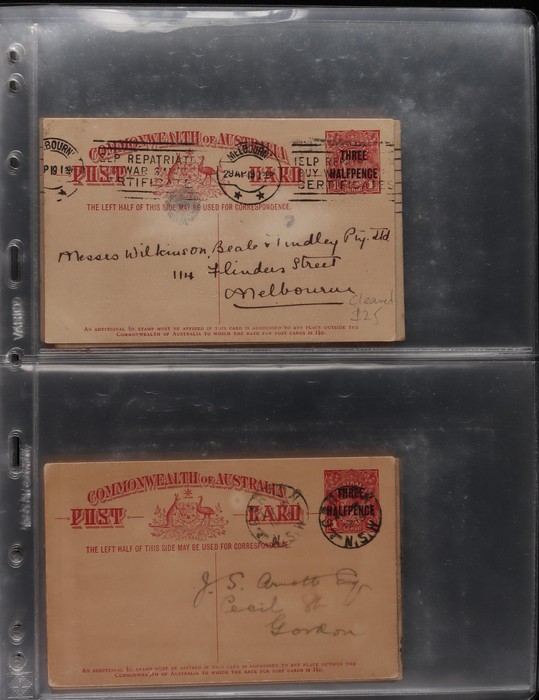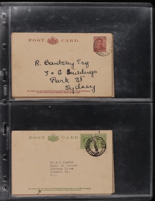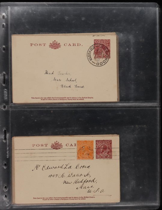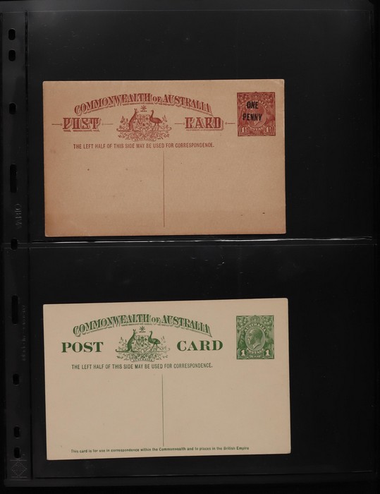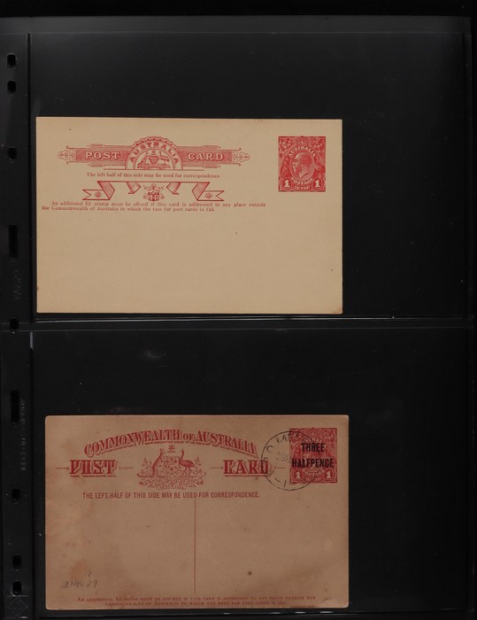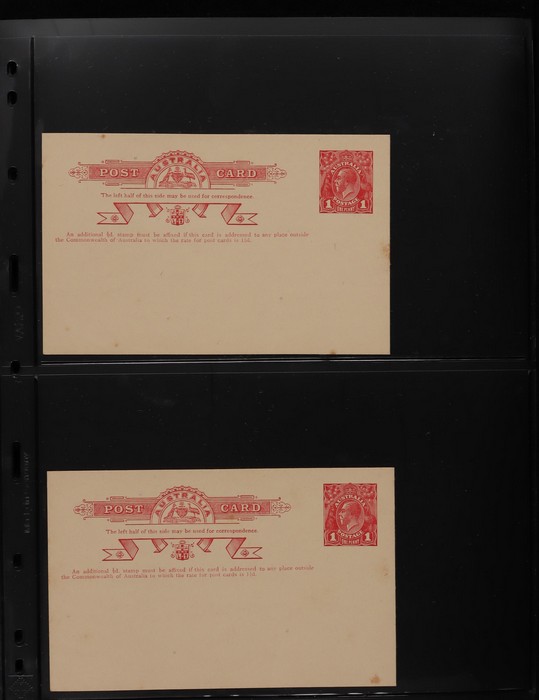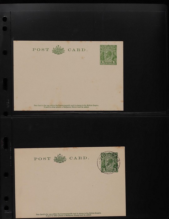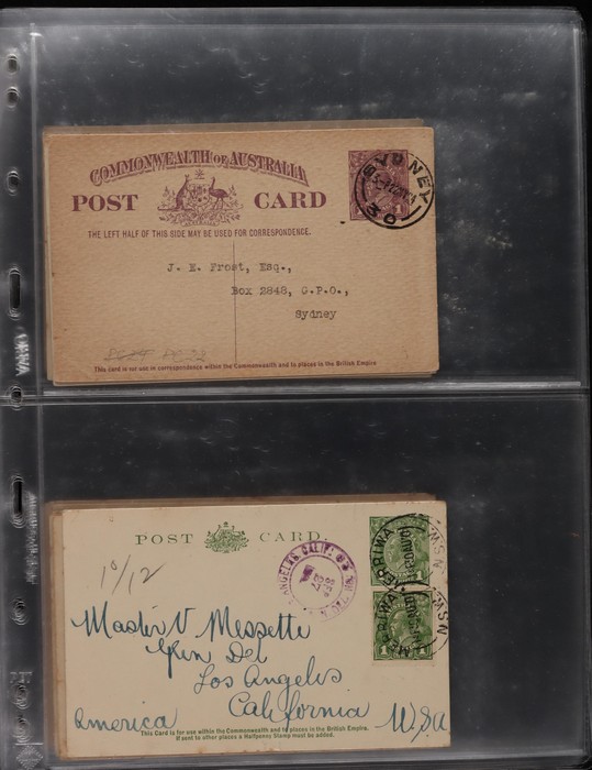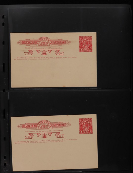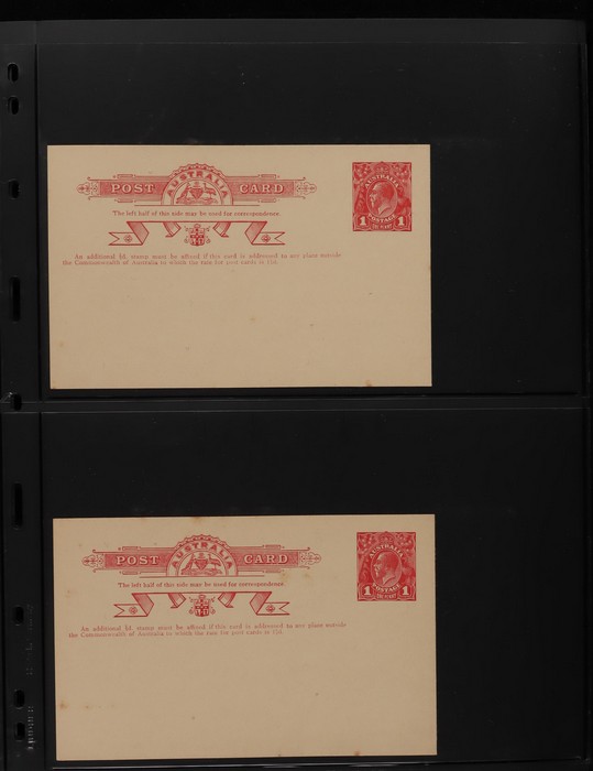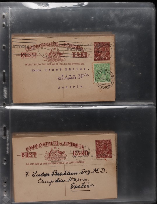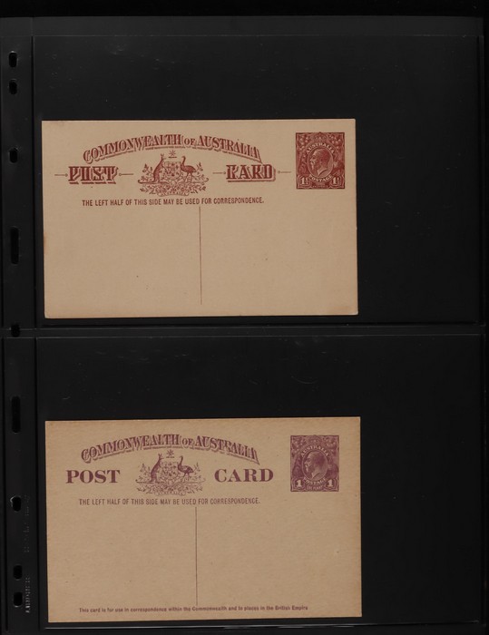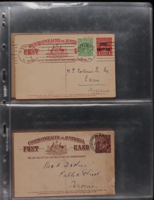 collection UN & U, starts with 1911 Fullface 1d red 'address only' (2, ACSC cat $150), Coronation cards (5, $625), 1d red 'the left half', 1913 Kangaroo (3 inc on buff, $225), KGV Sideface 1d red ($150), & with extra text (11, $880), 1918 Surch
