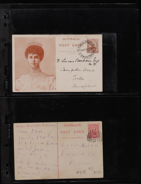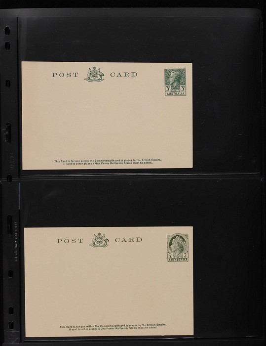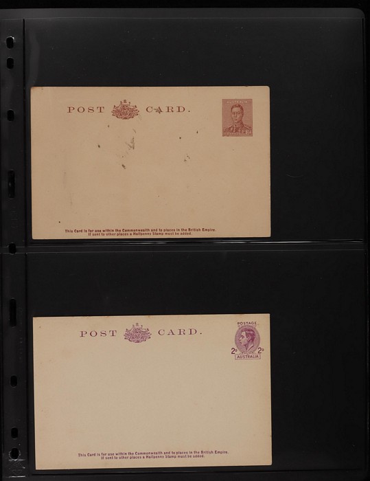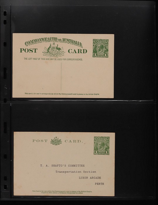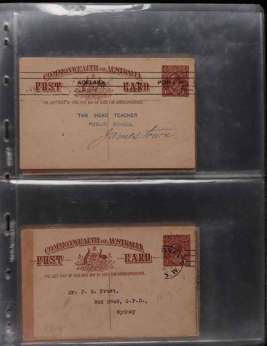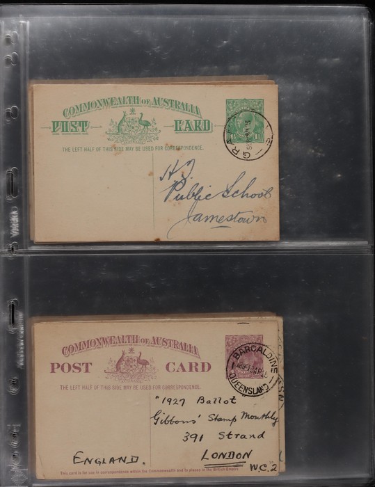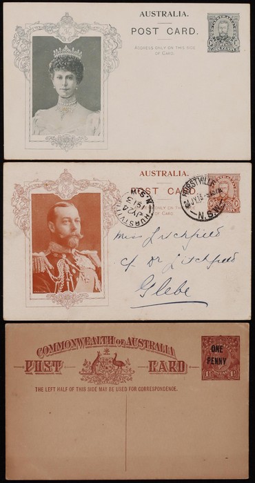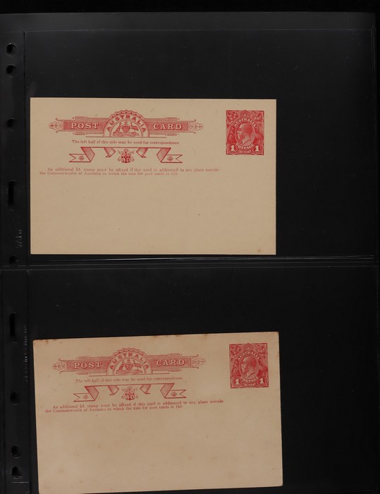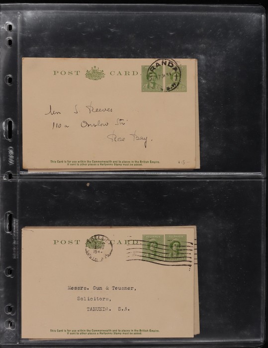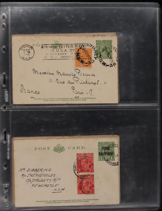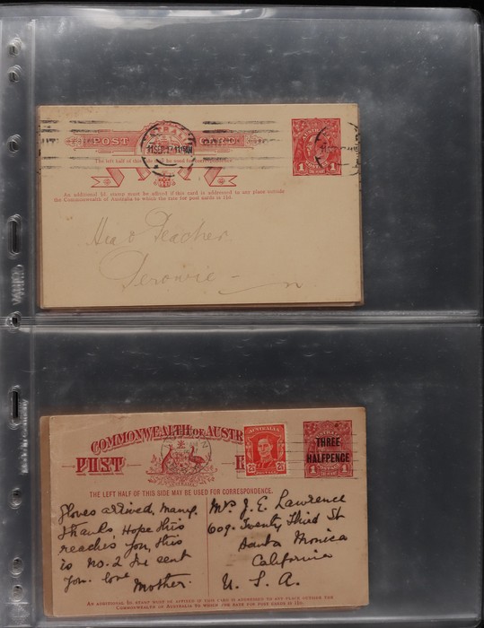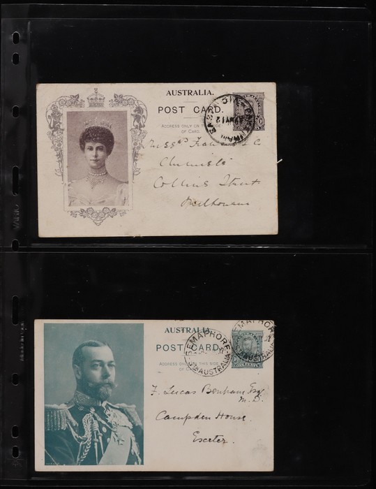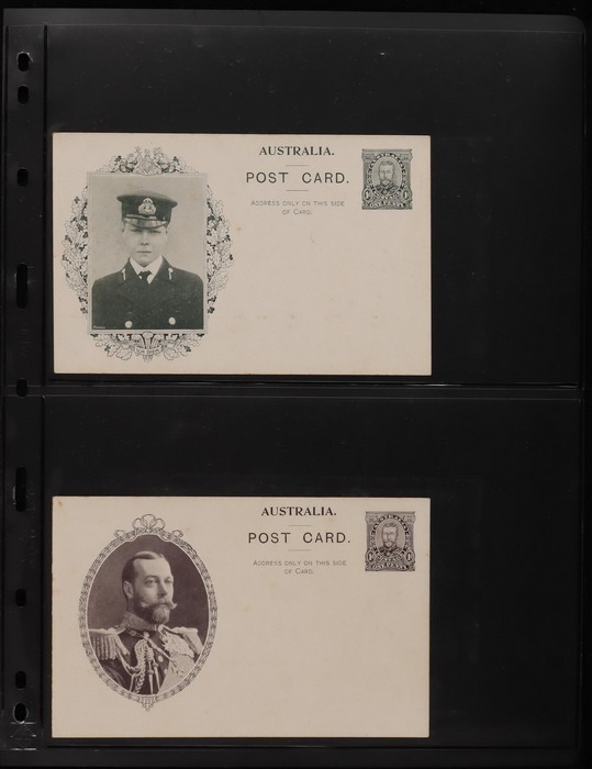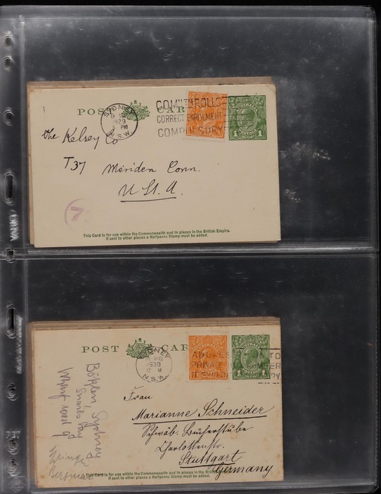 collection UN & U, starts with 1911 Fullface 1d red 'address only' (2, ACSC cat $150), Coronation cards (5, $625), 1d red 'the left half', 1913 Kangaroo (3 inc on buff, $225), KGV Sideface 1d red ($150), & with extra text (11, $880), 1918 Surch