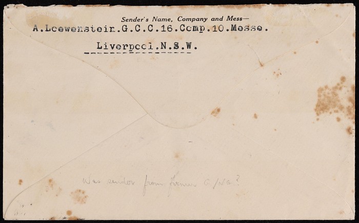 with printed 'Prisoner Of War Letter FREE' double ring 25mm, with camp Commander signature censor h/s. To Melbourne, 'Liverpool 11 MY 17' cds. From A Loewensteir GCC16 Comp 10 Messe Liverpool. Tones. ASC X3.5 cat $125 in 1993. (Image1) (Image2)