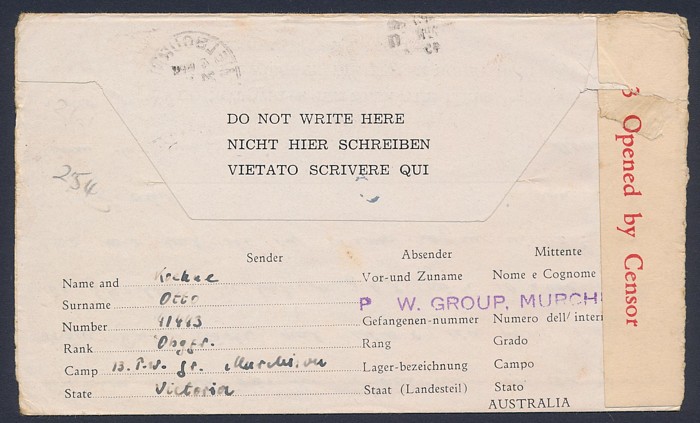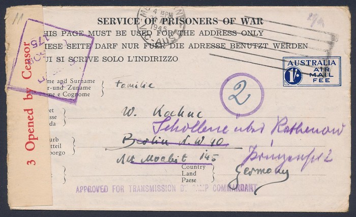 Air Mail 1/- lettersheet (code aw 200m 3/43), with 'Melbourne FEB 1944' machine pmk, from prisoner at 13 POW Group Murchison to Germany, with 'Approved for transmission?' h/s, plus censor label & h/s. VFU. ACSC POW2 cat $400 to Germany. (P) (Image1) (Image2)