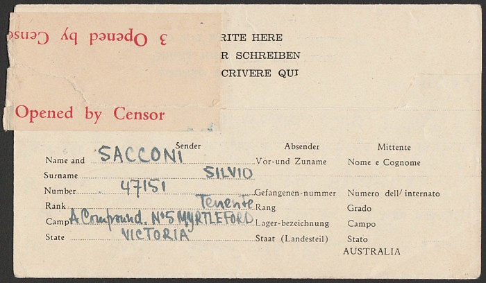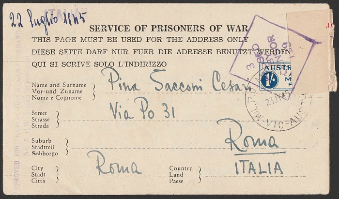 Airmail 1/- blue Lettersheet with ' Mi PO Myrtleford 23 JY 45'. To Italy with censor tape & cachet. VFU. ACSC POW2 cat $250. (P) (Image1) (Image2)
