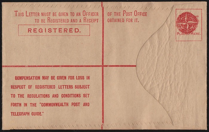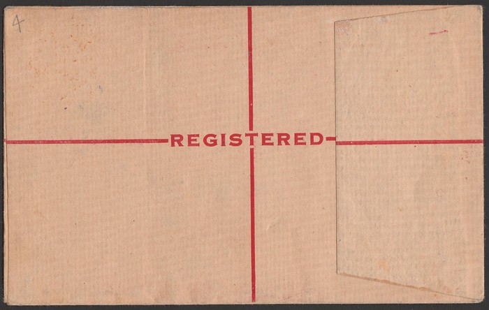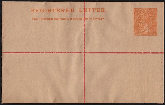 Envelope: 1913 Kangaroo 4d orange with 'Registered' box, text setting 1. VF fresh UN. ACSC RE1A cat $400. (P) (Image1) (Image2)