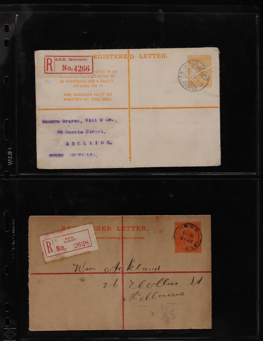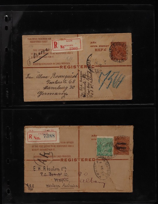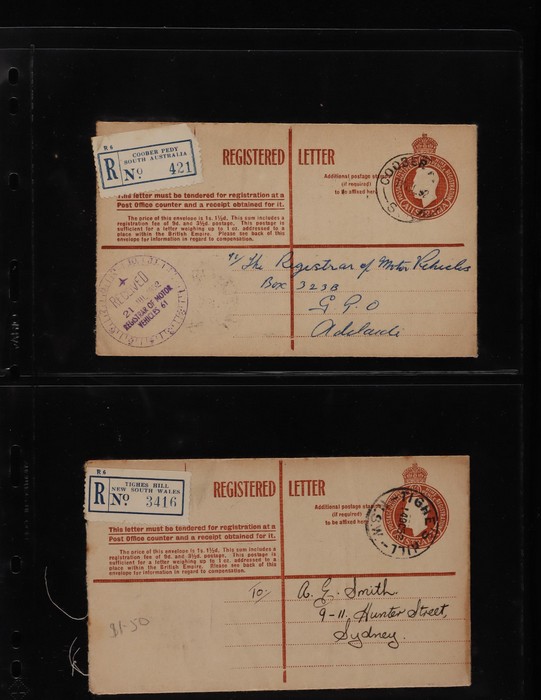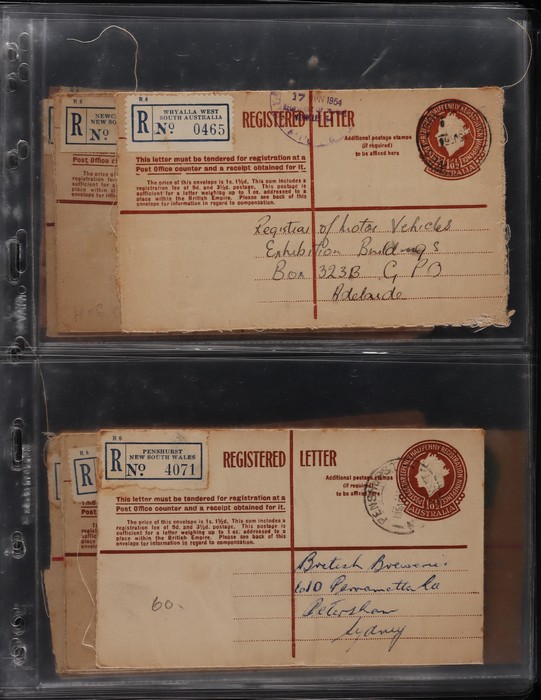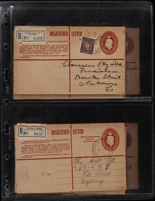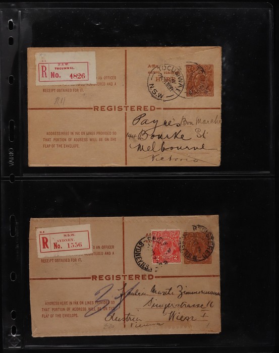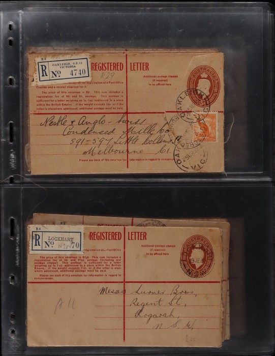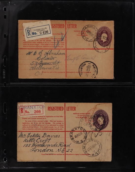 3285 imageRegistered Envelopes: 1914-67 used range with Kangaroo 4d uprated (ACSC RE3B), 1916-20 KGV 4d uprated use of old NSW stock (RE6A & 8), 1920-21 KGV 5d old NSW stock (RE10A), 1921 new format 5d straight edge flap (RE11A & B), 1922 curved flap (RE12), 4½d surch (RE17 & 17d), 1928-30 oval die 4½d violet both sizes (RE21 & 22), same with 5d surch (RE24B & 25), KGVI oval die 5d 3 diff (RE 29-31), QEII 1/7 (RE 38), 2/5, 24c & 25c (RE 42, & 45-6). F-VFU. ACSC cat $1273+ with some very interesting usages. (20). (Image1) (Image2) (Image3) (Image4) (Image5) (Image6) (Image7)