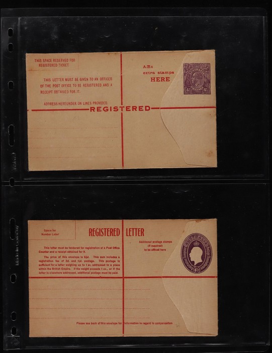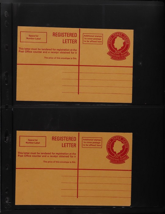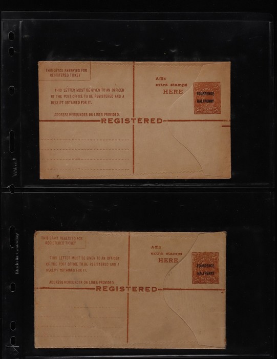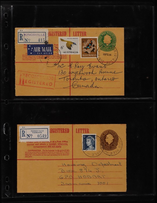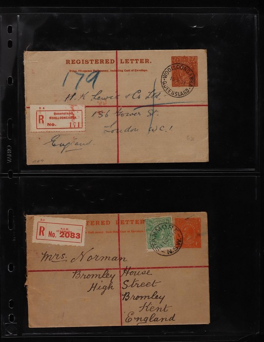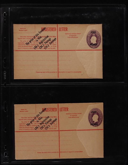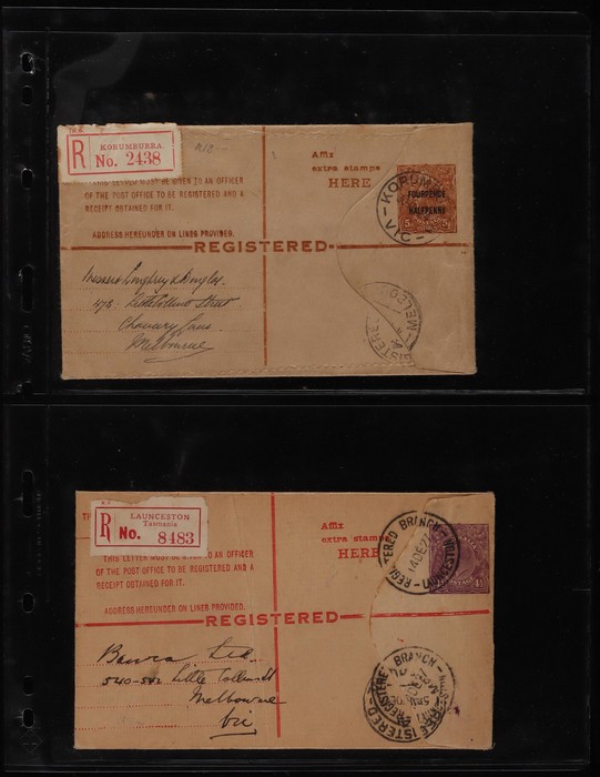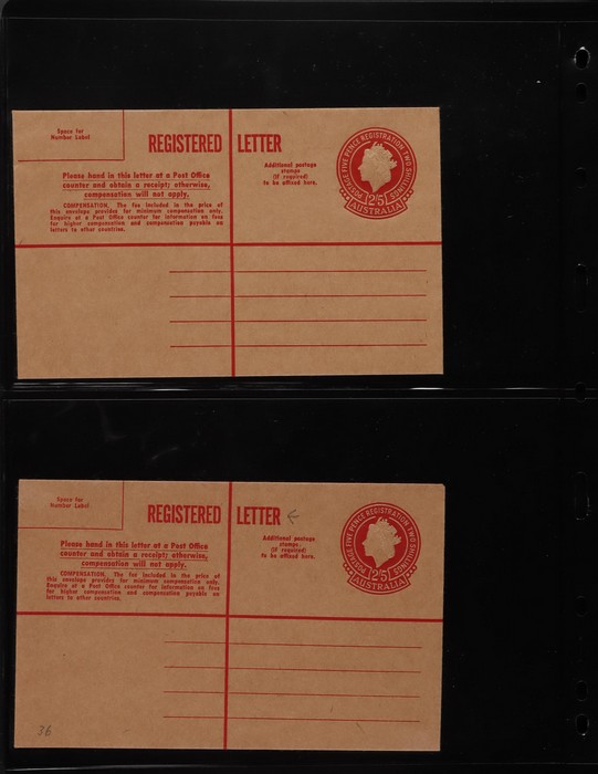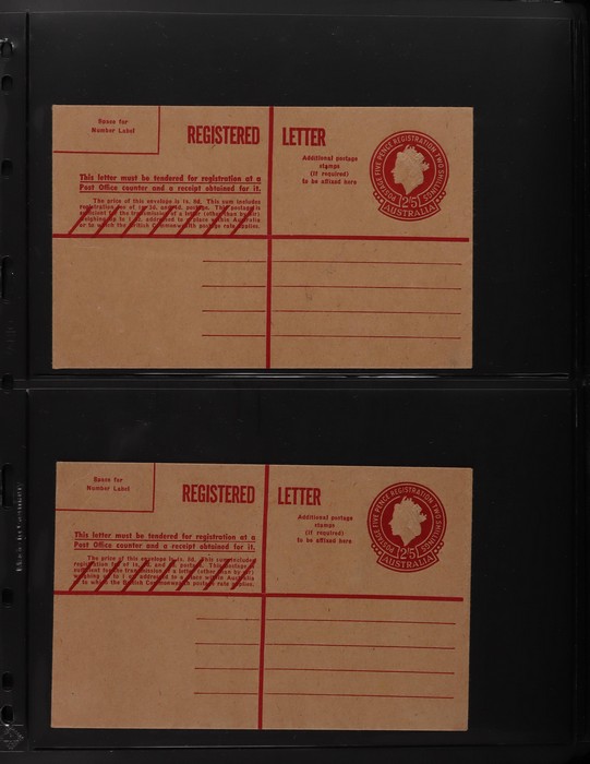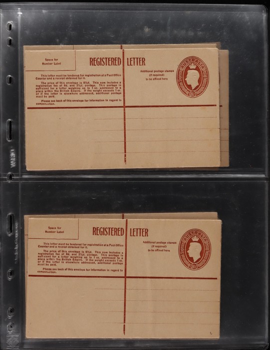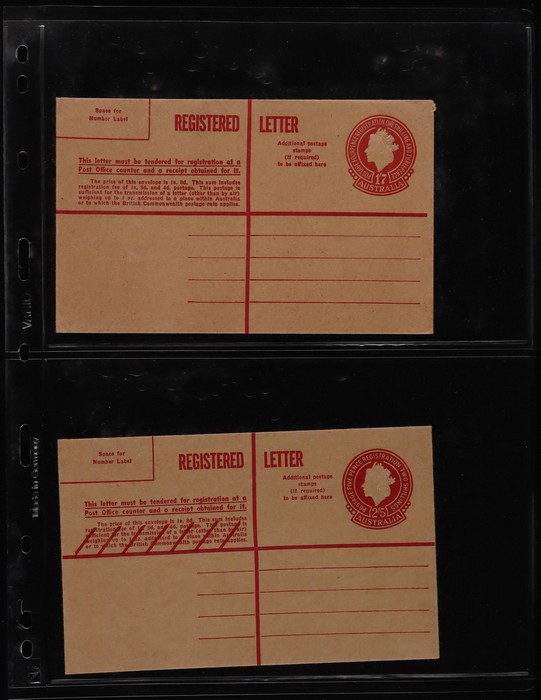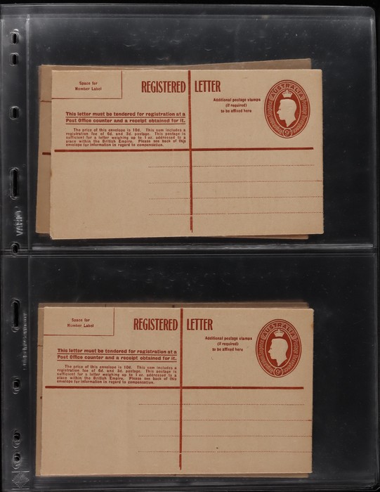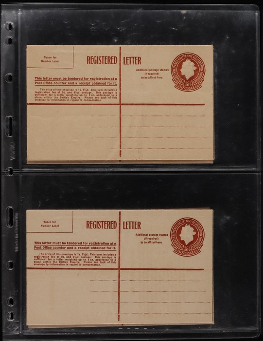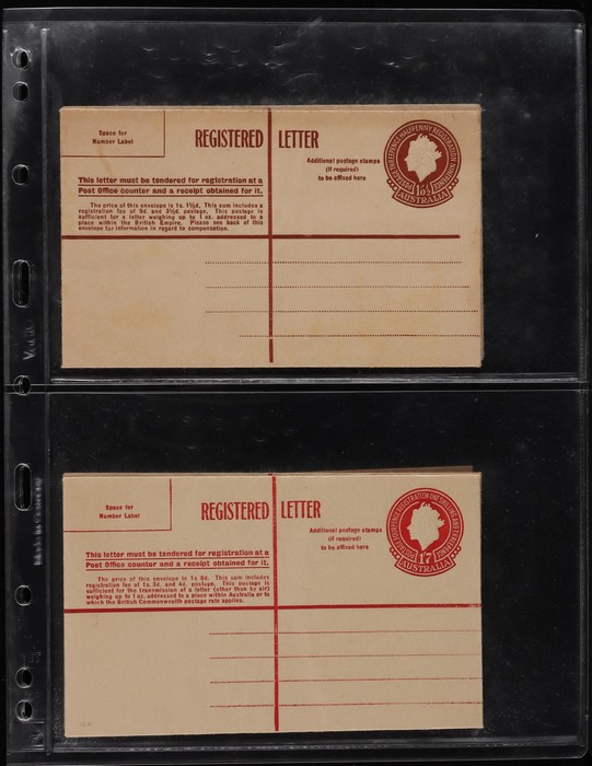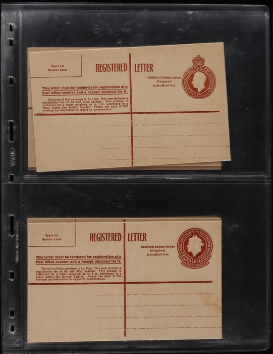 3286 imageRegistered Envelopes: 1913-67 collection with Kangaroo 4d orange (2), ACSC RE1 (cat $400) & RE3 ($75), 1916 KGV 4d orange RE6 (2, $150), 5d brown on old stock RE10 ($75), then new setting with square flap, 1922 curved flap, 1923 Surch 4½d on 5d with barred out reverse text (2, RE16 $200), new text RE17 'envelope' (4, $400), 1925 4½d violet with red text RE20 (2, $80), 1928 oval die (3, $240) & long type ($80), 1930 Surch 5d on oval die (2, $80), then oval die 5d (4, $150), KGVI 5d (2, $20), 5½d red text (7), brown text (2), 8½d (3), 9d (3), 1/0½ (5), 1/7 red (3), 2/5 (6), 24c green (3) & 25c brown. These all U. ACSC cat $2370. Also UN. Surch 4½d on KGV 5d ACSC RE17d (cat $400), 4½d violet Sideface with red text RE20 ($125) & oval die ($125) & oval die ($150), 1930 Surch oval die (2) plus long type (total $350), then KGVI 5½d (2, $160), 8½d, 9d & 1/0½ (3 ea, $600). Next is QEII with 1/0½ brown, 1/7 red (4 ea, $280), 2/5 red inc diff types (6, $220), 24c & 25c (2 ea, $40). Also stampless formula type in brown (2, $150) & Christmas Id 30c & 53c (2). F-VF UN, mostly fresh. These cat $2500+, total $4900+. (41 UN, 85 U) (Image1) (Image2) (Image3) (Image4) (Image5) (Image6) (Image7) (Image8) (Image9) (Image10) (Image11) (Image12) (Image13) (Image14) (Image15) (Image16) (Image17) (Image18) (Image19) (Image20) (Image21) (Image22) (Image23) (Image24) (Image25) (Image26) (Image27) (Image28) (Image29) (Image30) (Image31) (Image32) (Image33) (Image34) (Image35) (Image36) (Image37) (Image38) (Image39) (Image40) (Image41) (Image42) (Image43) (Image44) (Image45) (Image46) (Image47) (Image48) (Image49) (Image50) (Image51) (Image52) (Image53) (Image54) (Image55)