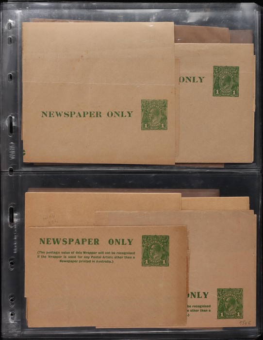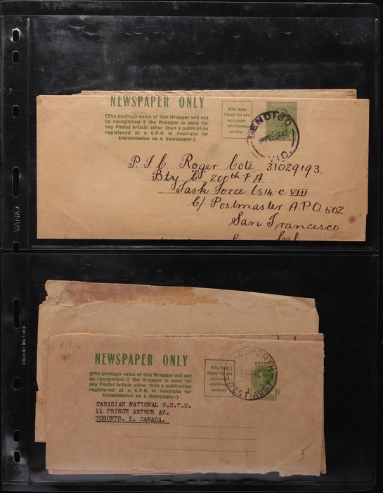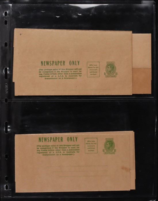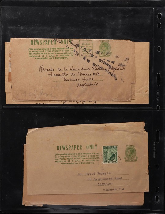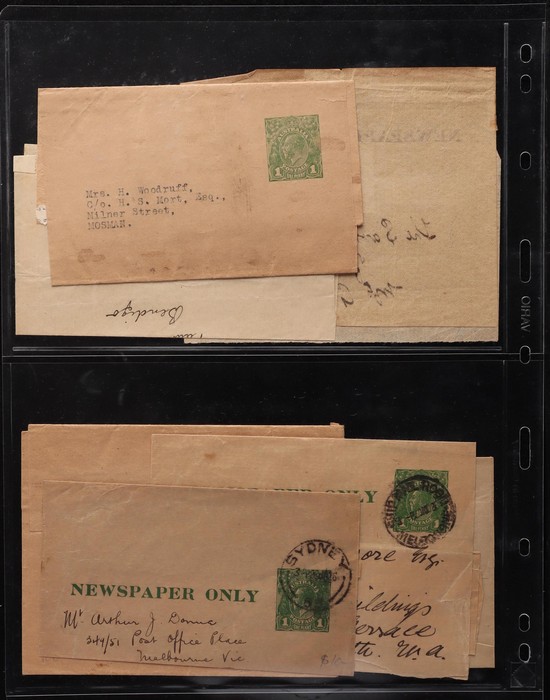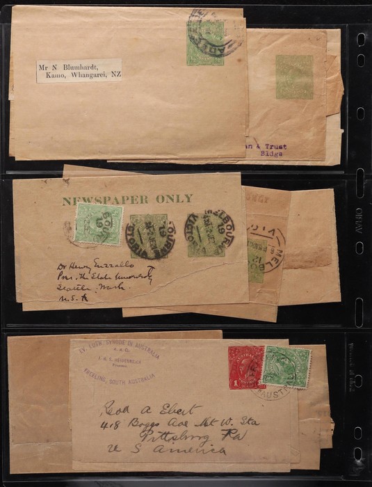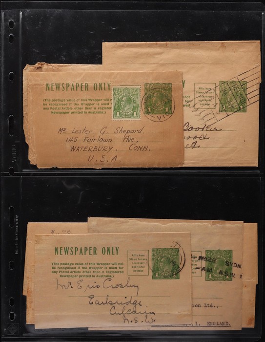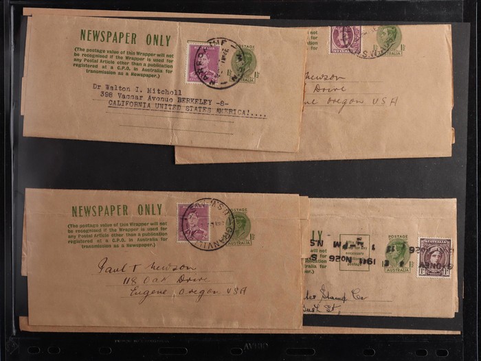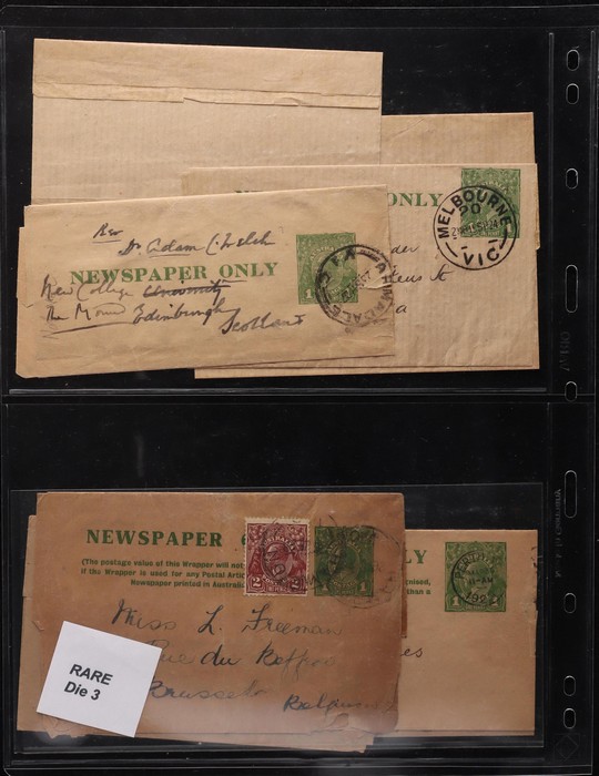 3292 imageWrappers: 1913-70s collection with 1913 Kangaroo ½d green (4, ACSC cat $300), KGV ½d green (4, $160), ½d+½d green (2, $150), 1d red (2, $150), 1d violet (4, $135) inc CTO & front only PTPO w/o 'Newspaper Only', 1d green w/o test PTPO (2, $400), then PO type 1d green (8, $170), 1927 extra text Die I & Die III ($80), 1931 with stamp box (4, $52), 1938 Queen 1d (2, $60) inc uprated to Germany, KGVI 1½d ($200), 1942 new stamp (9, inc large PTPO 1½d Official $290), 1947 PTPO oval 2½d red (8, $800) & Doubleton 2½d+2½d (3, $225). 1953 QEII 2½d brown CTO, 5d blue & red ($50) etc. Also 1949 1½d+1½d green Doubleton front only, QEII PTPO 5d light blue front & 5d dark blue PTPO ($200). Mostly VFU, about 10 fronts only. ACSC cat $3450 plus the fronts. A stunning collection. (65) (Image1) (Image2) (Image3) (Image4) (Image5) (Image6) (Image7) (Image8) (Image9) (Image10) (Image11) (Image12) (Image13) (Image14) (Image15) (Image16) (Image17) (Image18) (Image19) (Image20) (Image21) (Image22) (Image23)
