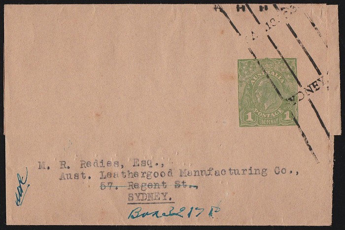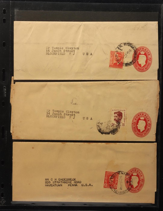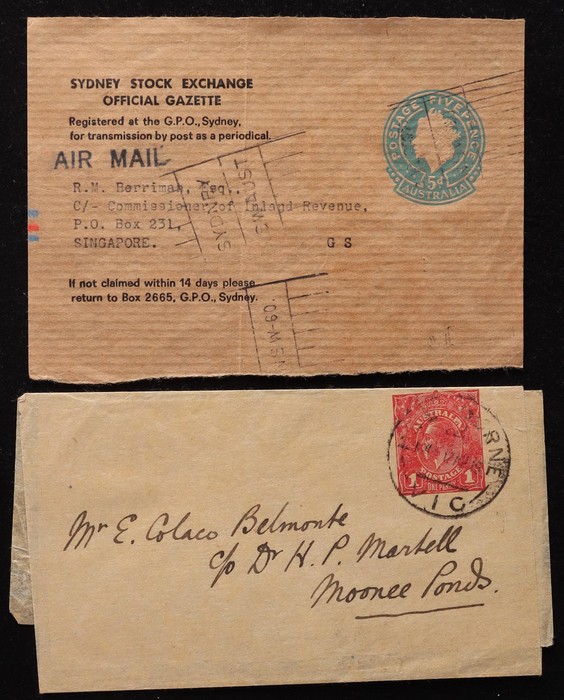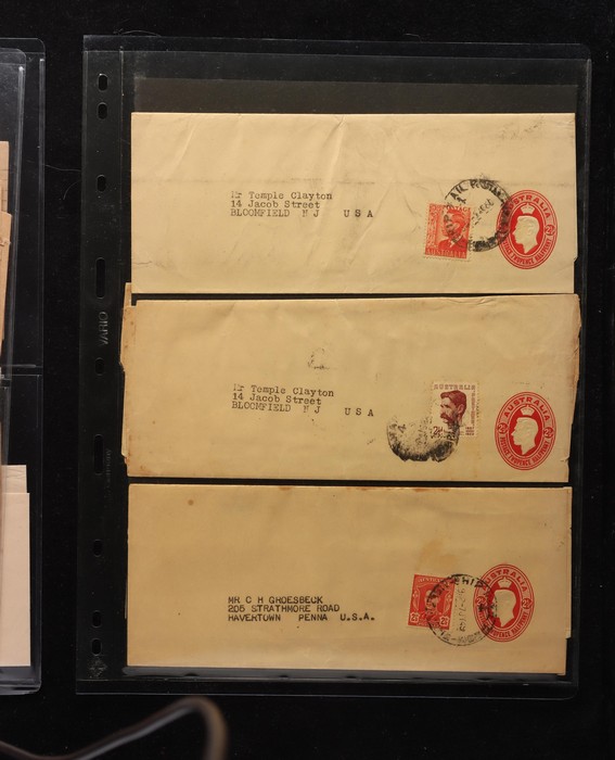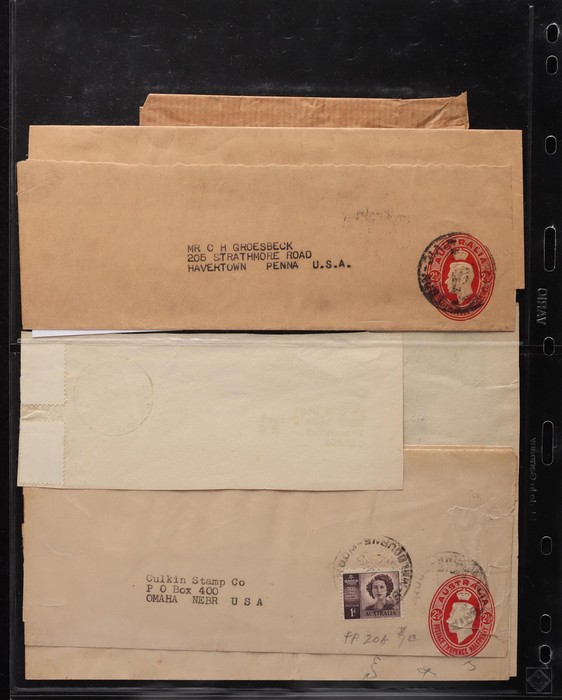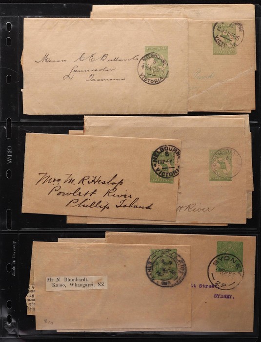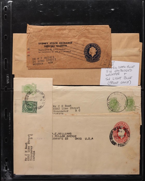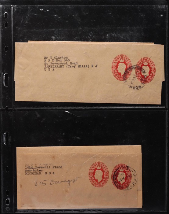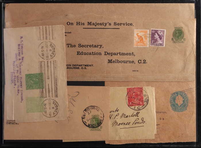 3292 imageWrappers: 1913-70s collection with 1913 Kangaroo ½d green (4, ACSC cat $300), KGV ½d green (4, $160), ½d+½d green (2, $150), 1d red (2, $150), 1d violet (4, $135) inc CTO & front only PTPO w/o 'Newspaper Only', 1d green w/o test PTPO (2, $400), then PO type 1d green (8, $170), 1927 extra text Die I & Die III ($80), 1931 with stamp box (4, $52), 1938 Queen 1d (2, $60) inc uprated to Germany, KGVI 1½d ($200), 1942 new stamp (9, inc large PTPO 1½d Official $290), 1947 PTPO oval 2½d red (8, $800) & Doubleton 2½d+2½d (3, $225). 1953 QEII 2½d brown CTO, 5d blue & red ($50) etc. Also 1949 1½d+1½d green Doubleton front only, QEII PTPO 5d light blue front & 5d dark blue PTPO ($200). Mostly VFU, about 10 fronts only. ACSC cat $3450 plus the fronts. A stunning collection. (65) (Image1) (Image2) (Image3) (Image4) (Image5) (Image6) (Image7) (Image8) (Image9) (Image10) (Image11) (Image12) (Image13) (Image14) (Image15) (Image16) (Image17) (Image18) (Image19) (Image20) (Image21) (Image22) (Image23)