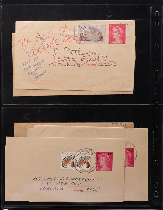 3295 imageWrappers: 1938-50s range with 1953 QEII 2½d brown (3) inc uprated for Airmail letter rate (total franking 1/6), 1959 5d blue & 1975 11c/7c uprated. Also 1938 Queen 1d PO & PTPO ($180) & QEII PTPO 3½d orange embossed ($250). Mostly G-VFU, some mixed. ACSC cat $600. (9) (Image1) (Image2) (Image3)