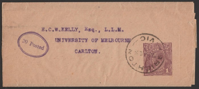 3299 imageWrapper - PTPO: 1915-19 KGV 1d red Die II with ' 20 Posted' h/s. Superb U, 'Melbourne 24 JE 1921' pmk. ACSC WS9 cat $2000. Die II are extremely rare with only several recorded & unique usage. 2024 Ceremuga AIEP photo cert. (P) (Image1) (Image2)