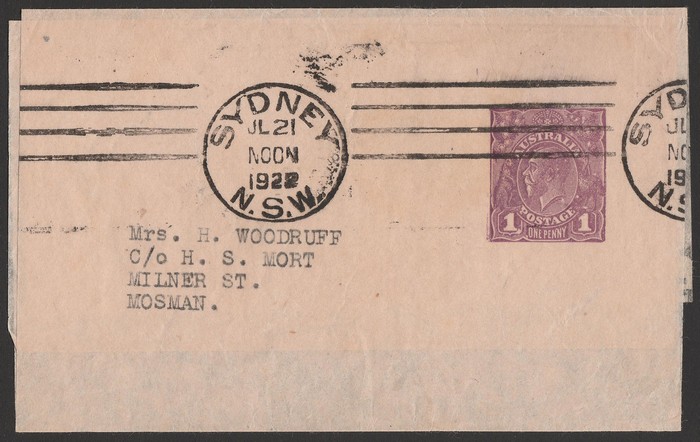 3301 imageWrapper - PTPO: 1922-24 KGV 1d violet w/o text. Superb U, 'Sydney Noon JL 21 1922' pmk, probably Sydney Stock Exchange. ACSC WS11 cat $200+. This is the example shown in ACSC cat. (Image1) (Image2)