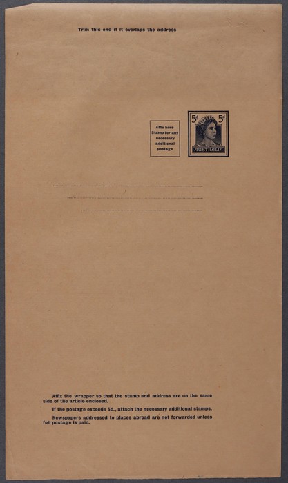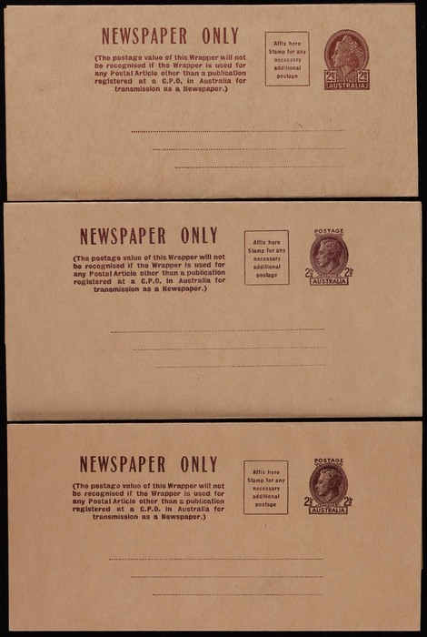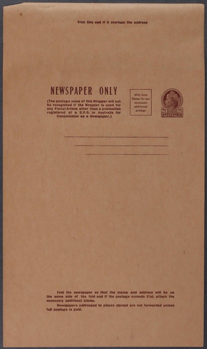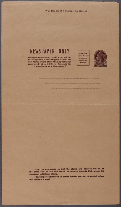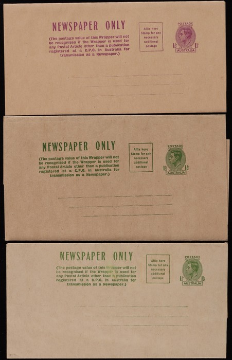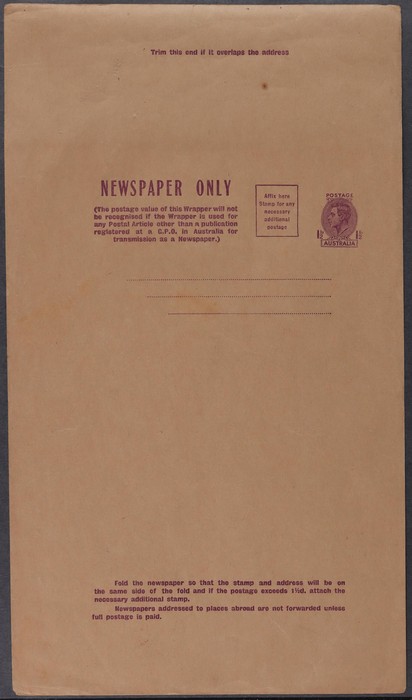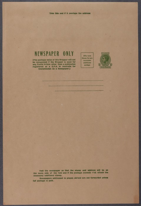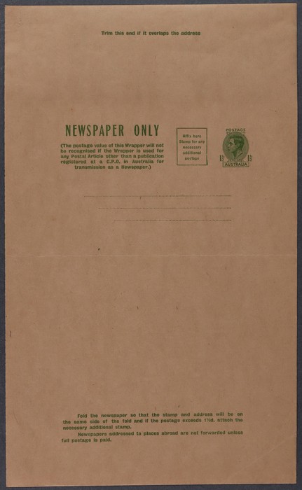 3305 imageWrapper - PTPO: 1942 KGVI 1½d green wide wrapper (190x260mm) with REGISTERED NEWSPAPERS h/s. VF fresh UN with centre fold. ACSC WS25 cat $400. Very rare. (P) (Image1)