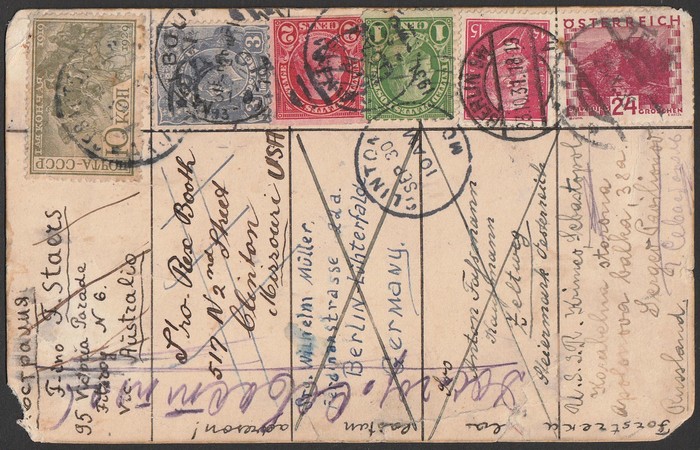 3310 image1931 Esperanto 'chain' postcard from Crimea Russia around the world & back to Crimea, sent via & franked Australia, USA, Germany, Austria & Russia, plus Cinderella of Dr Zamenhof, creator of the language. Typical flts having spent 6 months in transit. (P) (Image1) (Image2)