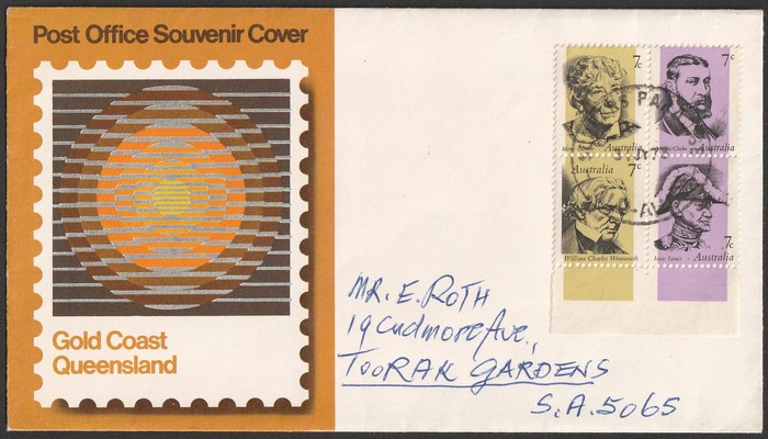 3316 image1972 Gold Coast Queensland PO souvenir cover with stylised 'Noon Sun' pictorial at left, franked 1973 Fam Aust blk of 4 pmk 'Surfers Paradise 31 JY 73 Qld Aust'. A rare envelope, Almeida SES cat $500 (1997). (Image1) (Image2)