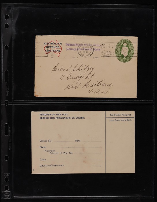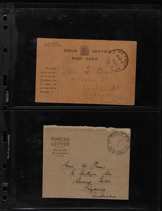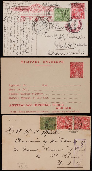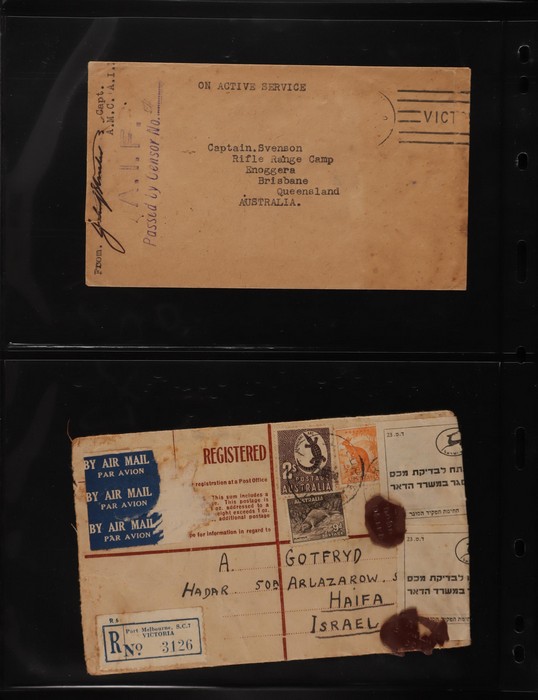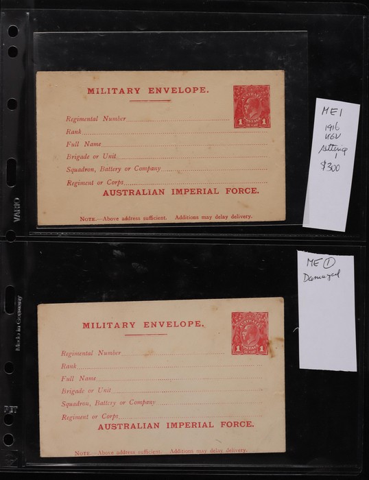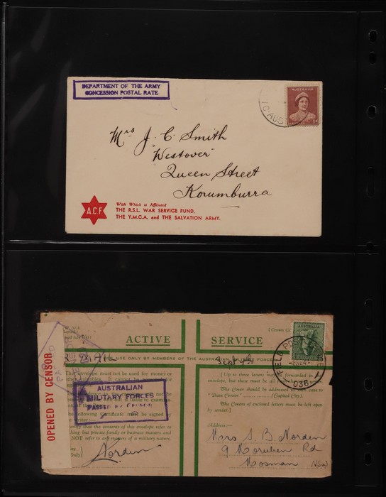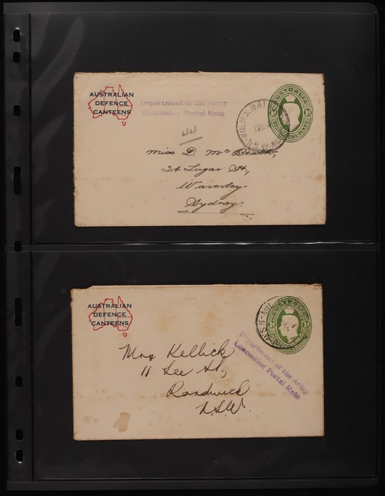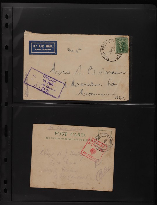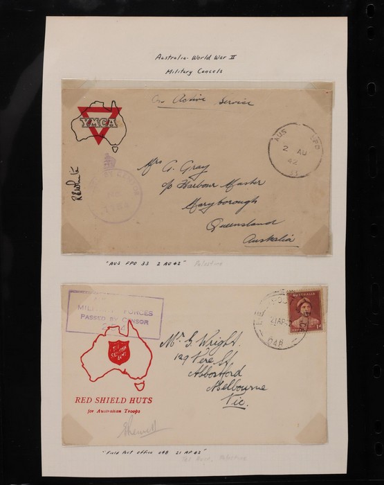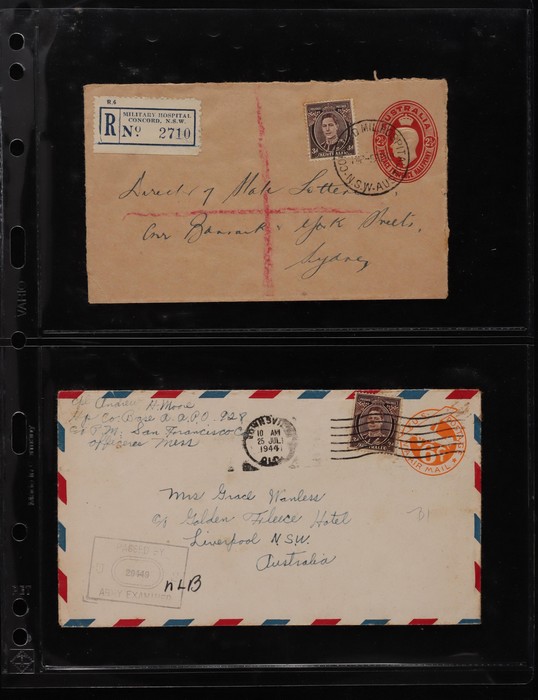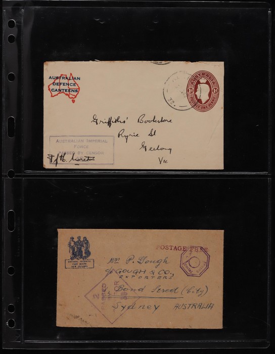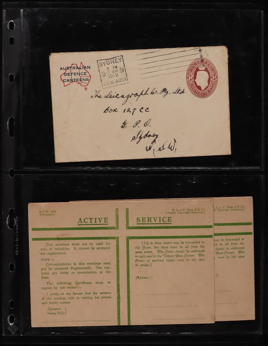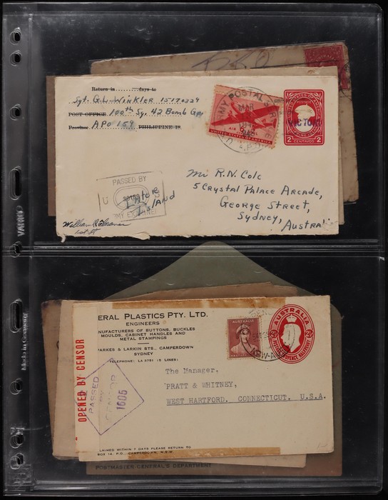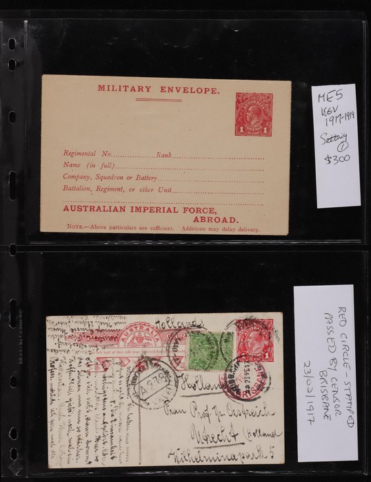 3317 imageMilitary & Censor Mail collection with Postal Stationery inc KGV 1d red card uprated to Holland with Brisbane Censor red cds, Military envelope KGV 1d red (3 UN) ACSC MEI (2) & MES - ACSC cat $900, plus KGVI wrapper to USA envelopes, Vietnam envelope & Airletter ea UN & CTO plus stampless Pic envelopes UN (10), 1941-42 Defence Canteens envelopes 1d brown (2) & 1d green (6) cat $180+, 1943 use of Queen 1d+1d green Doubleton Postcard uprated to USA. WWI FPO & Active Service cards inc '2 Aust LH BDE Field PO 1900' cds, covers with KGV 1d red, 1½d black-brown, 2d orange inc perf OS. The mostly WWII with censored inc various cachets, KGVI 5½d red envelope uprated opt BCOF ½d with Army PO cds, 1950 Reg envelope uprated by Air to Israel with censor tape, to/from inc India, USA, NZ, Sth Africa, Algeria 1944 to Australia with Algeria?, USA & Australia censor h/s. GB & Australia Postage Dues, USA intact Ration Book & much more. (100+) (Image1) (Image2) (Image3) (Image4) (Image5) (Image6) (Image7) (Image8) (Image9) (Image10) (Image11) (Image12) (Image13) (Image14) (Image15) (Image16) (Image17) (Image18) (Image19) (Image20) (Image21) (Image22) (Image23) (Image24) (Image25) (Image26) (Image27) (Image28) (Image29) (Image30) (Image31) (Image32) (Image33) (Image34) (Image35) (Image36) (Image37) (Image38) (Image39) (Image40) (Image41) (Image42) (Image43) (Image44) (Image45) (Image46) (Image47) (Image48) (Image49) (Image50) (Image51) (Image52) (Image53) (Image54) (Image55) (Image56)