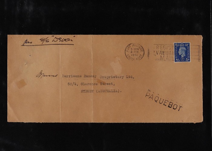 3313 image1935 Airmail cover (sl blemishes) franked with Kangaroo CofA wmk 5/-, KGV 1d & 1/- Lyrebird tied by 2 strikes of 'Ship Mail Room Melbourne' (29 Oct) cds, to England. ACSC cat $750+ for such mixed franking. (Image1) (Image2)