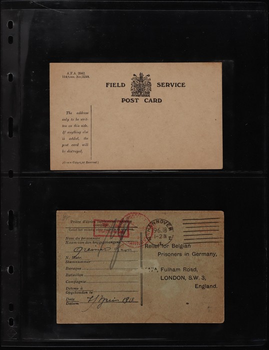 3308 image1916-17 inwards Prisoner Of War Kreigsgefangen-Sendung cards sent by 3639 Pte HA Pryor, 54th Bn AIF to Australia from Germany with printed texts for Stendahl or Wittenberg with camp censor cachets. 4 sound, others very mixed condition inc with tape repairs etc. Very rare mail from Australian POW in Germany. (9). (P) (Image1) (Image2) (Image3) (Image4)