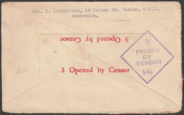 3319 imagePOW: 1943 use of printed Red Cross envelope to prisoner ,NX43326 Cpl R C Litchfield' in POW Keijo Chosen (Korea). Also to same POW use of plain envelope with 'Gordon 27 JA 44' cds, both with censor tape & cachet. (2) (P) (Image1) (Image2)