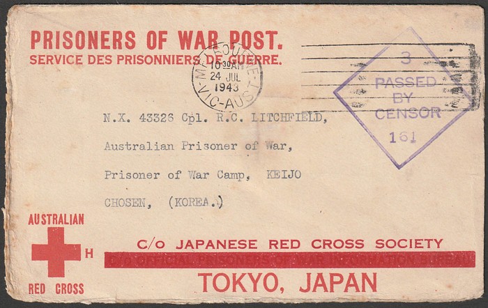 3320 imagePOW: 1943 use of printed Australian Red Cross envelope to prisoner NX 43326 Cpl RC Litchfield in POW Camp Keijo Chosen (Korea). From Melbourne with censor cachet front, back & censor tape. (P) (Image1) (Image2)