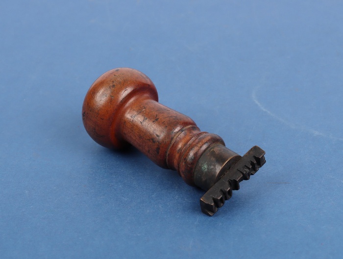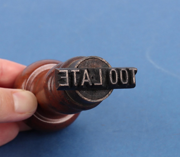 3323 image1860s-1930s 'TOO LATE' unframed h/s (40x8mm) with turned wooden handle, total 90mm high. (Image1) (Image2)