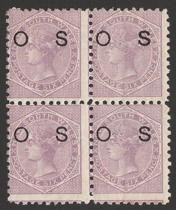 6d mauve, blk of 4, wmk crown NSW (w40), perf 10. F-VF M/3MNH. SG O31 cat £100 for M, MNH should be at least double, £175, plus premium for blk. (4) (P)