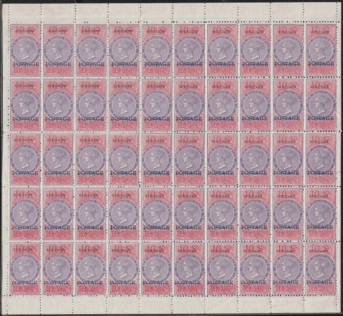 blue opt QV 10/- mauve & claret, opt SPECIMEN, FULL SHEET of 50, perf 10. Mostly superb fresh MNH, 4 stamps diag crease & sl perf separation in middle. SG 241as cat £4000 for M singles (normal M cat £95,000), MNH should be at least