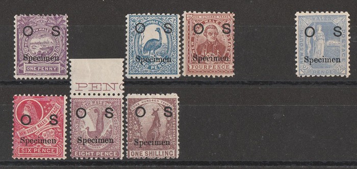 Centenary set 1d to 1/-, opt SPECIMEN type 8, plus 1891 'OS' opt 'Australia' 2½d blue. F-VF MNH. SG O39s-O44s & O54s cat £260 for M, should be at least double, £520 MNH (7) (P) (Image1)