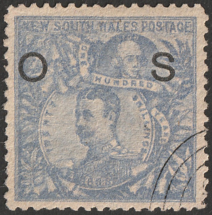 Carrington 20/- cobalt-blue, perf 10, wmk 5/- sideways, from 1895 special printing for PO sets. VF CTO with gum, NSW ovals pmk. SG O48(var) cat £1100. Rare as only 208 sold (only 158 with NSW pmk). Certificate can be obtained on request. (P) (Image1)