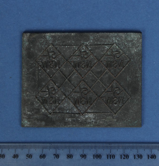 Master Plate of 6 of the '5/- NSW' in diamond wmk, used to make an impression in wax that is used to create the final wmk. Still with the interconnecting lines which are removed before cutting into single pieces to be affixed to the dandy roll. Made