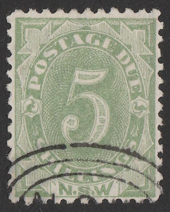 5/- green, perf 11. Superb U/CTO, concentric ovals NSW pmk. Scott J8a cat US$180. SG D8a cat £180+. ACSC ND34 cat $1250. Rare perf. (P) (Image1)