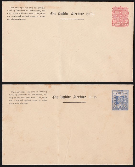 1900 Arms 1d red & QV 2d blue 'Parliamentary' envelopes 145x90mm UN, flaps stuck, tones as usual, very light centre folds. H&G DB16b & 17a. (2). (Image1)
