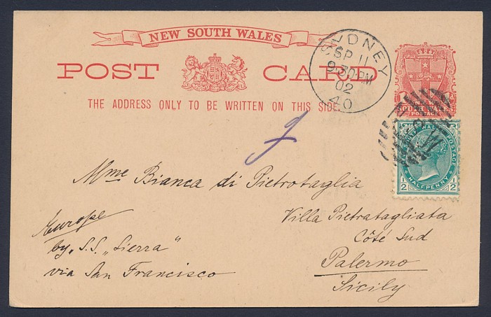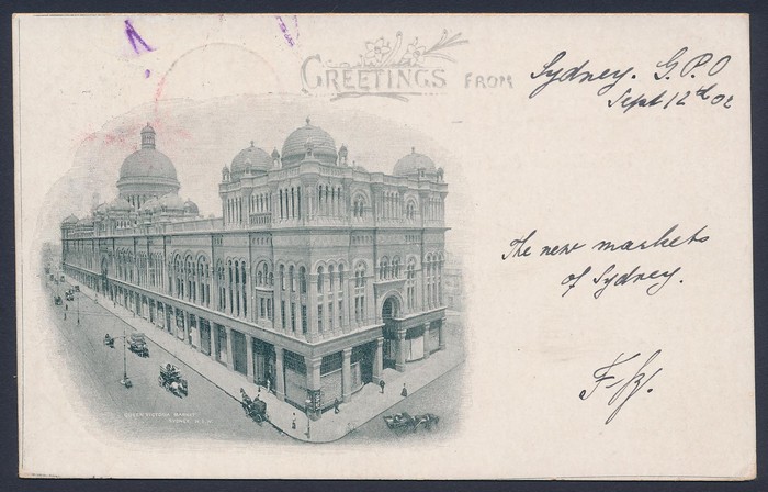 Shield 1d die 1, view 'Queen Victoria Market' in grey-black, 'Greetings from' in grey. VFU, uprated QV ½d to Sicily 'Sydney SP 11 02' duplex pmk. (Image1) (Image2)