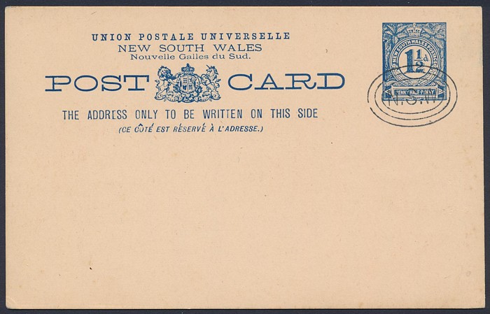 1½d blue view Technological Museum in dark red, 'With New Year Greetings' in salmon-pink. VF CTO NSW oval pmk. PSSA PC23b(var). (Image1) (Image2)