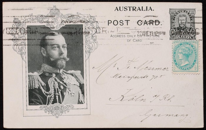 Coronation 1d purple-black King 50mm head in rectangle with shaded arms, type 2, white reverse. FU, uprated NSW QV ½d tied by 'Sydney JE 5 1911' pmk & Postage Paid cds. To Germany. ACSC P6(2)A cat $75+, plus premium for scarce mixed franking.