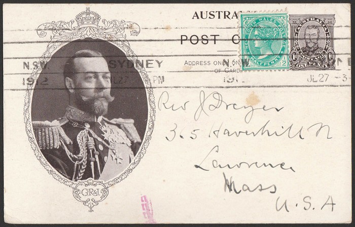 Coronation 1d black King 54mm head in oval oak leaf frame, type 2, white reverse. FU, uprated NSW QV ½d tied by 'Sydney JL 27 1912' pmk. To USA. ACSC P8(2)A cat $75+, plus premium for scarce mixed franking. (P) (Image1) (Image2)