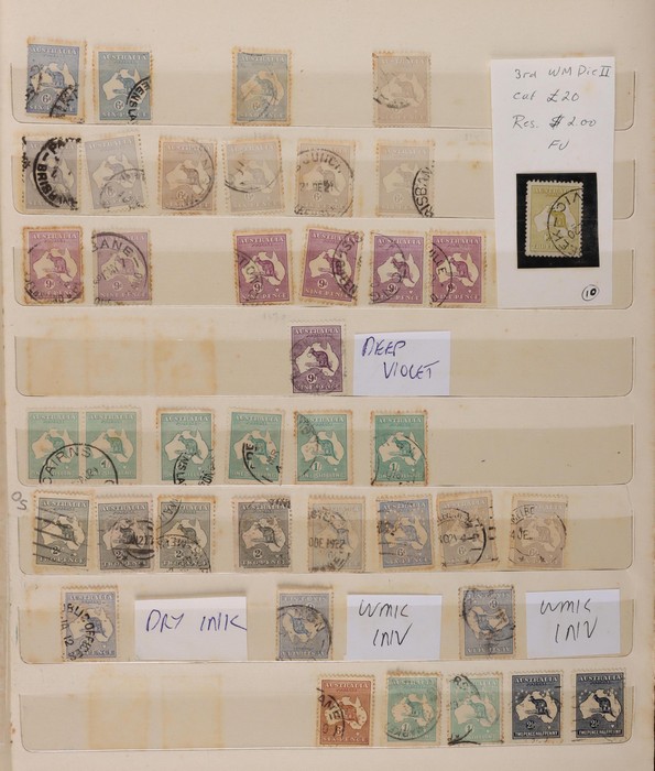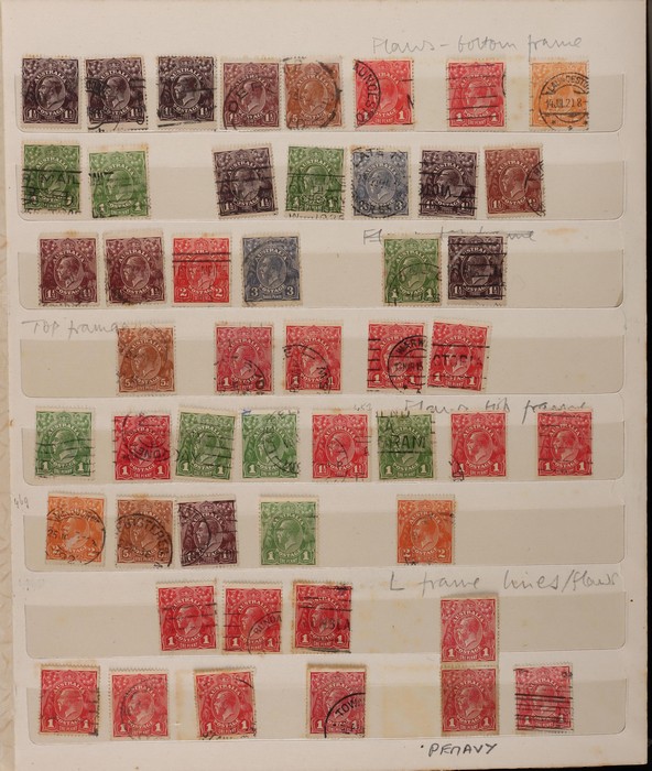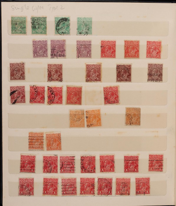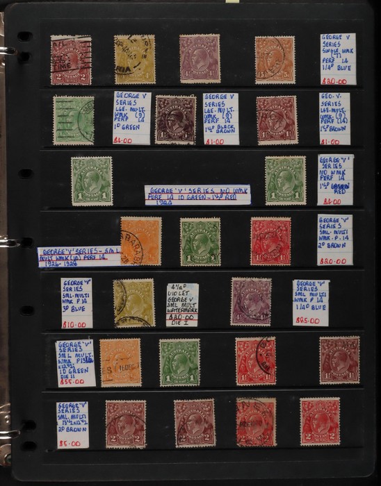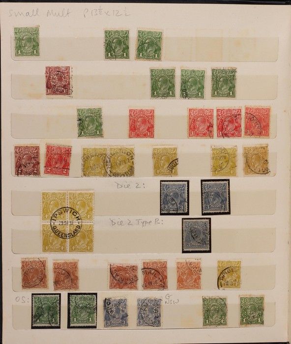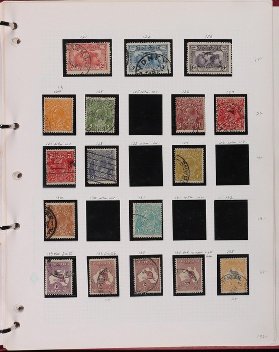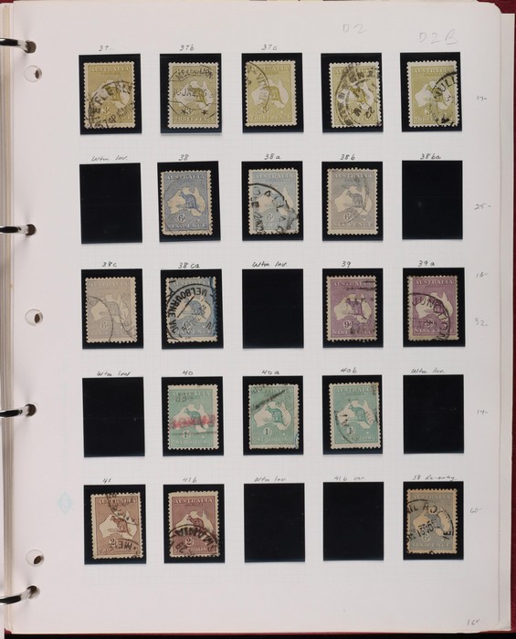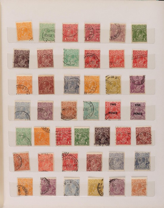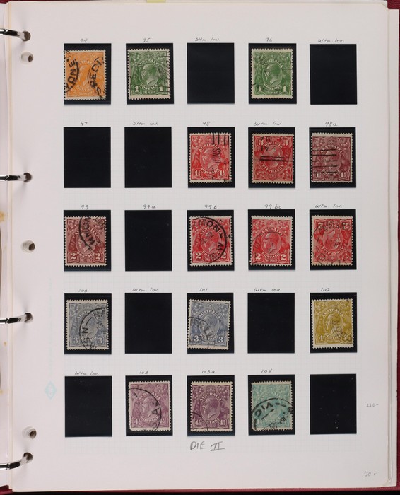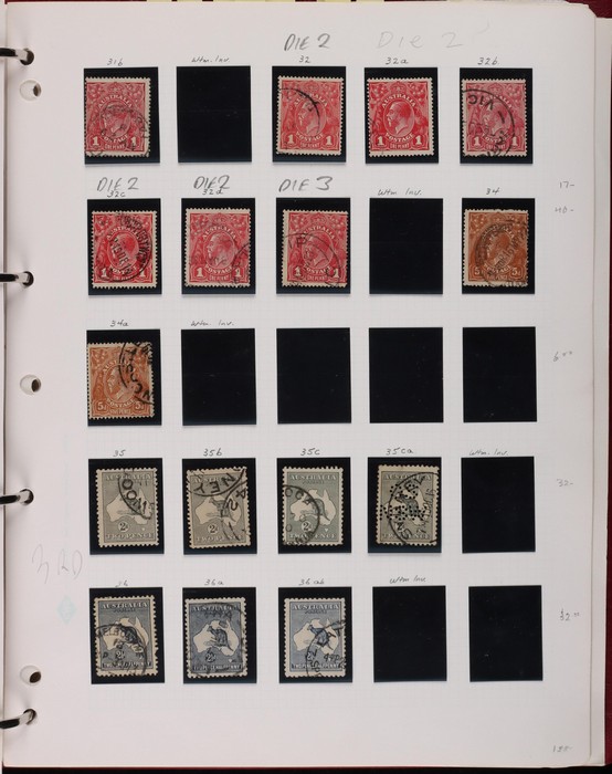 363 image1913-36 Definitive only Used collection with Kangaroos (150) to 5/- inc 1st wmk 4d orange (6) inc strip of 3, 5d brown (2), 9d & 1/- (perf OS). 3rd wmk 3d olive Die II VFU (cat $200), 6d blue 'dry ink' (perf OS, cat $275) & wmk INV (2, cat $275 ea, $500), 9d violet (7) inc scarce deep violet shade (ACSC 26 cat $200). SM wmk inc 9d (3) & 2/- (4). CofA wmk set to 5/-. KGV (370) to 1/4 inc single wmk perf O/NSW to 4d violet, 1d red (100+) in 'PENAVY' variety Mint & rough paper pink perf OS (2, ACSC 72G, cat $250 ea). SM wmk 4d blk of 4 with crisp 'Ipswich/Queensland' cds & CofA wmk set to 1/4. Some slightly mixed condition inc surface tone spots. Generally G-VFU condition. (520) (Image1) (Image2) (Image3) (Image4) (Image5) (Image6) (Image7) (Image8) (Image9) (Image10) (Image11) (Image12) (Image13)