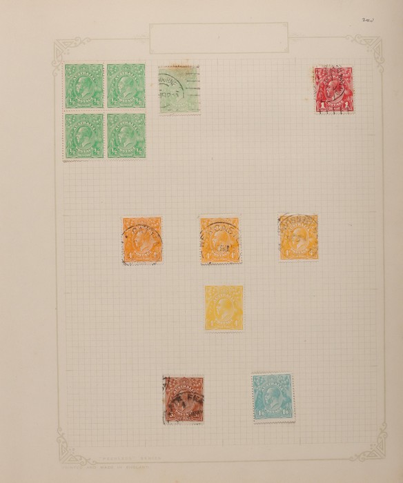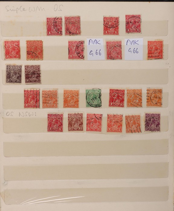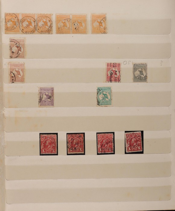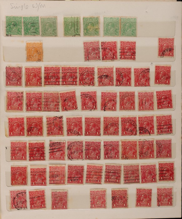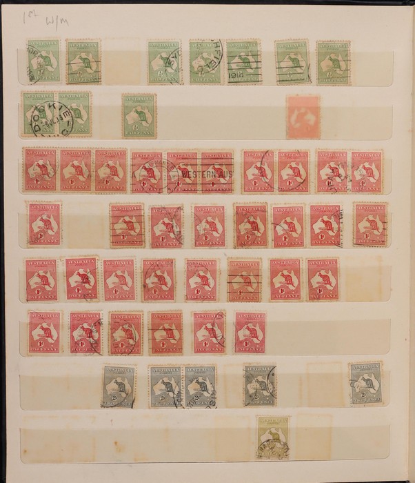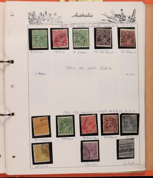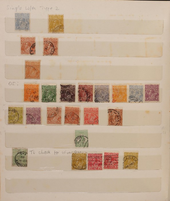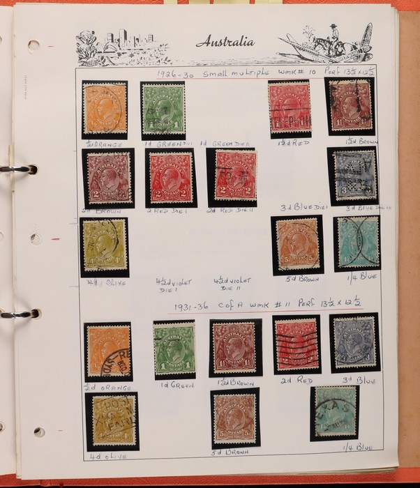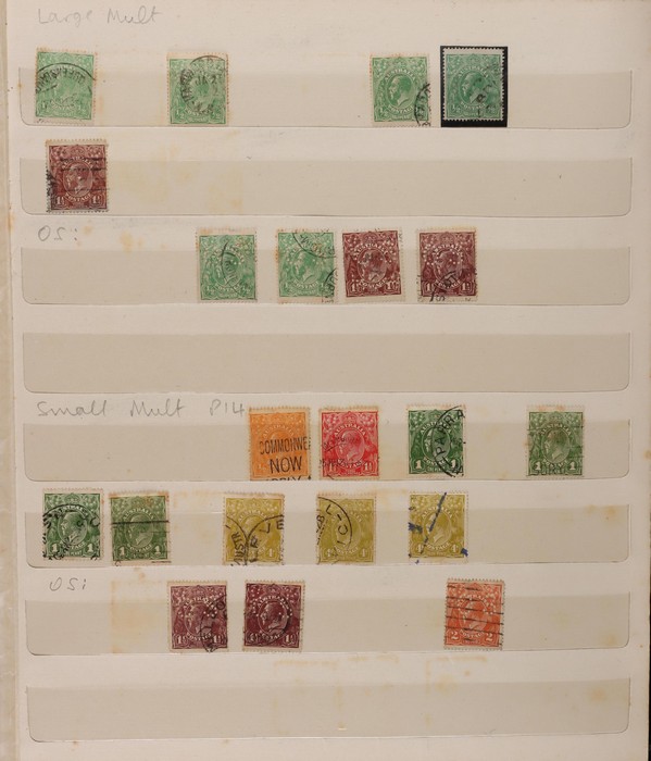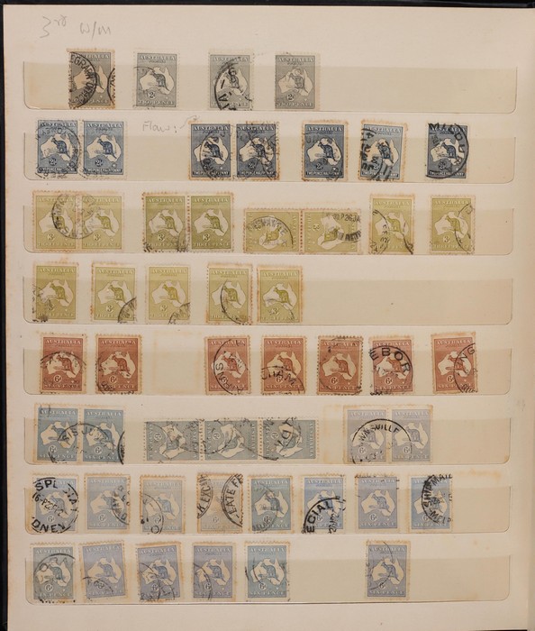 363 image1913-36 Definitive only Used collection with Kangaroos (150) to 5/- inc 1st wmk 4d orange (6) inc strip of 3, 5d brown (2), 9d & 1/- (perf OS). 3rd wmk 3d olive Die II VFU (cat $200), 6d blue 'dry ink' (perf OS, cat $275) & wmk INV (2, cat $275 ea, $500), 9d violet (7) inc scarce deep violet shade (ACSC 26 cat $200). SM wmk inc 9d (3) & 2/- (4). CofA wmk set to 5/-. KGV (370) to 1/4 inc single wmk perf O/NSW to 4d violet, 1d red (100+) in 'PENAVY' variety Mint & rough paper pink perf OS (2, ACSC 72G, cat $250 ea). SM wmk 4d blk of 4 with crisp 'Ipswich/Queensland' cds & CofA wmk set to 1/4. Some slightly mixed condition inc surface tone spots. Generally G-VFU condition. (520) (Image1) (Image2) (Image3) (Image4) (Image5) (Image6) (Image7) (Image8) (Image9) (Image10) (Image11) (Image12) (Image13)