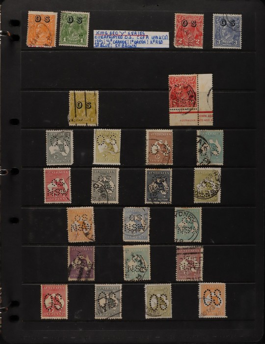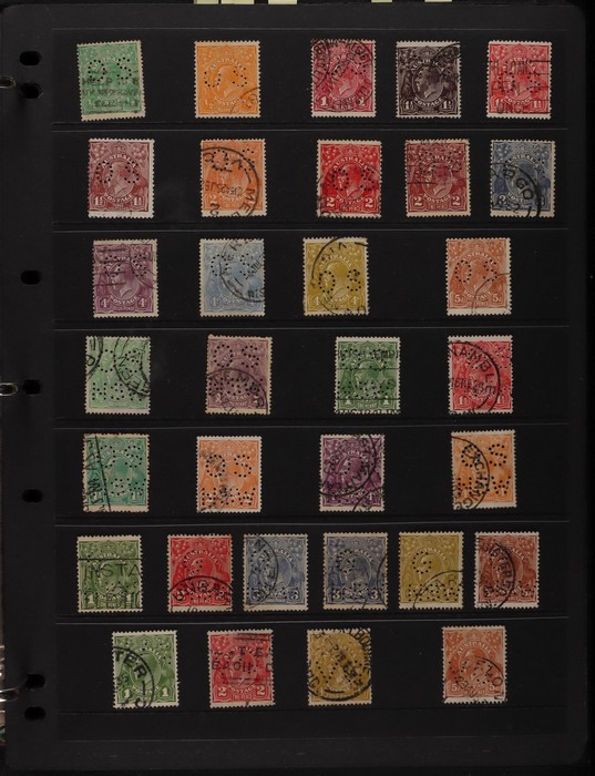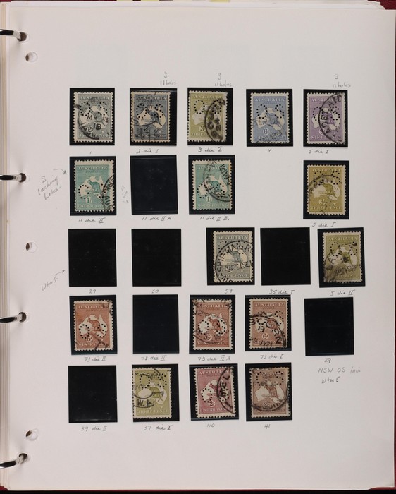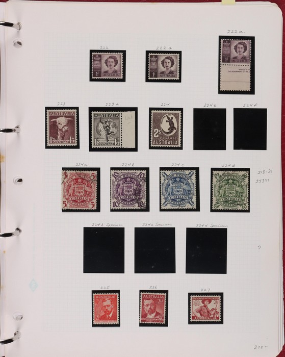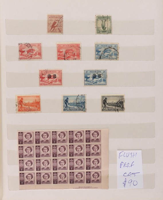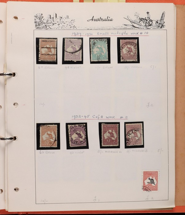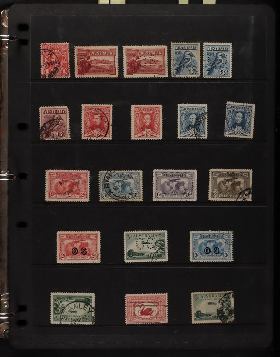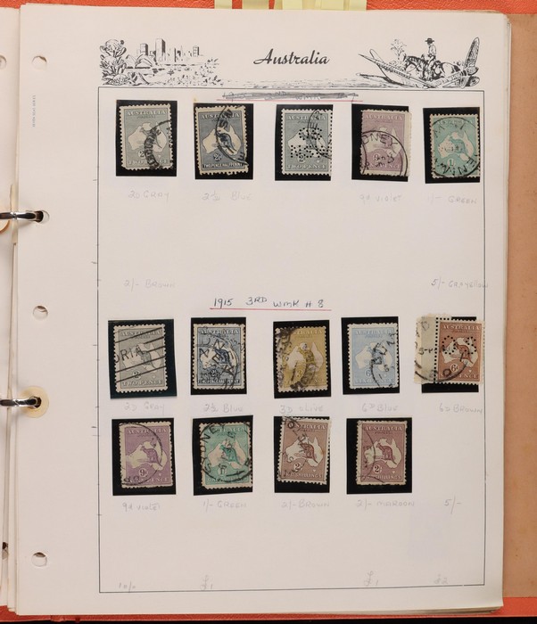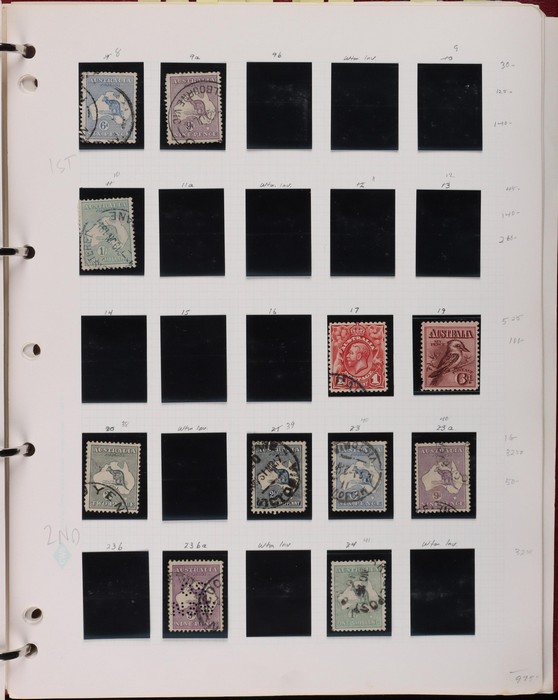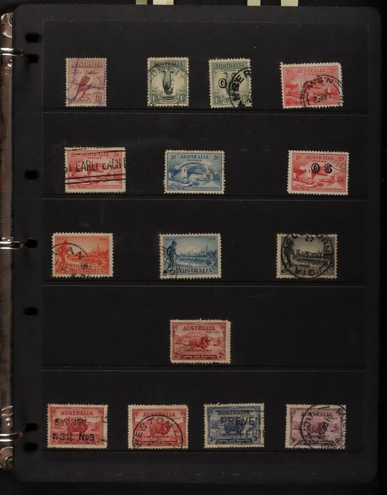 378 image1913-65 collection in hagner style album with Kangaroos 1st wmk to 1/- inc perf large OS to 4d, plus £2 black & rose with telegraph puncture. 2nd wmk 2d, 6d, 9d, 1/-, 2/- G-FU (ACSC cat $600). 3rd wmk to 2/- maroon, plus £1 brown & blue telegraph puncture. SM wmk set to 2/- maroon, CofA wmk to 5/-. Also OS perfin set 1d to 5/-, NSW Govt perfins (10) to 2/-, plus 6d Chestnut opt OS. ACSC cat $2200 to 5/- bi-colours as normal U KGV (100+) to 1/4 inc OS opts to 4d, Federal perfins to 5d & NSW State perfins to 5d. 1914 Kookaburra 6d Engraved, 1929 Airmail 3d green perf OS CTO. 1931 Kingsford Smith 2d, 3d opt OS, 1932 Lyrebird 1/- opt OS postally U. 1934 VIC Cent to 1/- & Macarthur set to 9d U. 1930s-40s imprint blks (25) inc 1948 Hermes 1/6 claret McCracken blk of 4. 1937 Robes set to £1. 1940 AIF set to 6d M. 1949 Arms to £2 U. 1950s/60s high val Commem sets & 1964 Navigator set of 8 to £2 King. Variable condition throughout, mixed M/MNH/G-F/VFU. ACSC cat $3700, plus another $4700 for the £1 & £2 bi-colour Kangaroos. (650) (P) (Image1) (Image2) (Image3) (Image4) (Image5) (Image6) (Image7) (Image8) (Image9) (Image10) (Image11) (Image12) (Image13) (Image14) (Image15) (Image16)