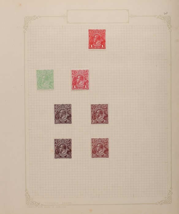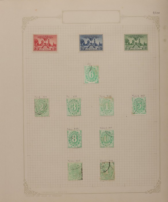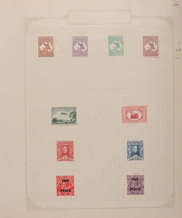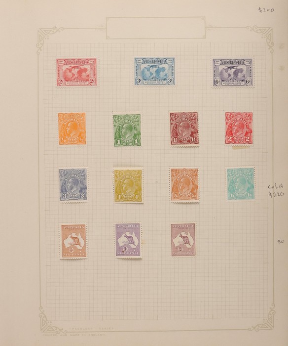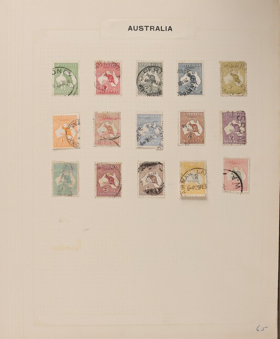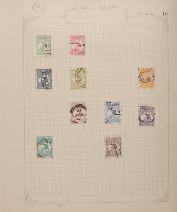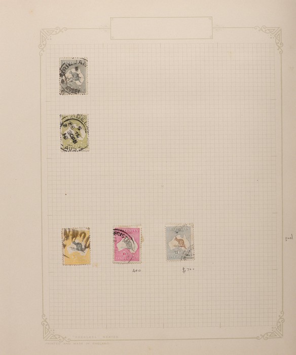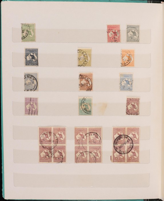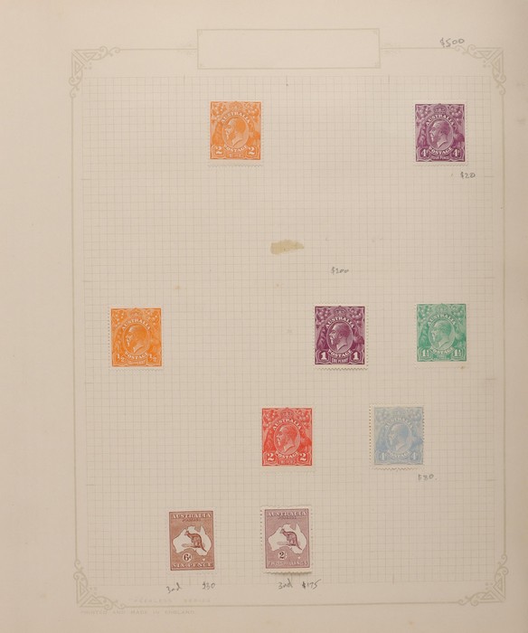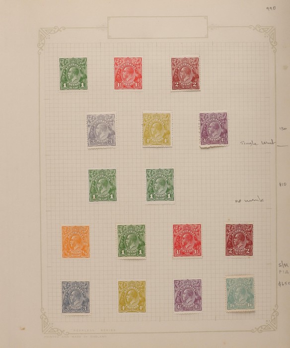 378 image1913-65 collection in hagner style album with Kangaroos 1st wmk to 1/- inc perf large OS to 4d, plus £2 black & rose with telegraph puncture. 2nd wmk 2d, 6d, 9d, 1/-, 2/- G-FU (ACSC cat $600). 3rd wmk to 2/- maroon, plus £1 brown & blue telegraph puncture. SM wmk set to 2/- maroon, CofA wmk to 5/-. Also OS perfin set 1d to 5/-, NSW Govt perfins (10) to 2/-, plus 6d Chestnut opt OS. ACSC cat $2200 to 5/- bi-colours as normal U KGV (100+) to 1/4 inc OS opts to 4d, Federal perfins to 5d & NSW State perfins to 5d. 1914 Kookaburra 6d Engraved, 1929 Airmail 3d green perf OS CTO. 1931 Kingsford Smith 2d, 3d opt OS, 1932 Lyrebird 1/- opt OS postally U. 1934 VIC Cent to 1/- & Macarthur set to 9d U. 1930s-40s imprint blks (25) inc 1948 Hermes 1/6 claret McCracken blk of 4. 1937 Robes set to £1. 1940 AIF set to 6d M. 1949 Arms to £2 U. 1950s/60s high val Commem sets & 1964 Navigator set of 8 to £2 King. Variable condition throughout, mixed M/MNH/G-F/VFU. ACSC cat $3700, plus another $4700 for the £1 & £2 bi-colour Kangaroos. (650) (P) (Image1) (Image2) (Image3) (Image4) (Image5) (Image6) (Image7) (Image8) (Image9) (Image10) (Image11) (Image12) (Image13) (Image14) (Image15) (Image16)