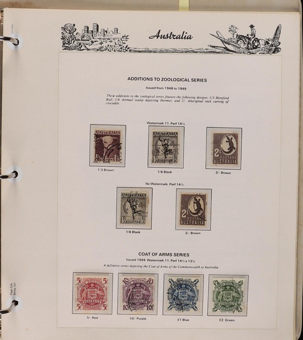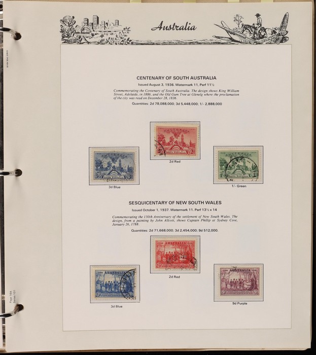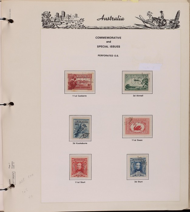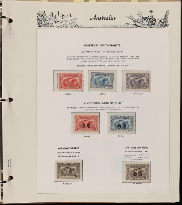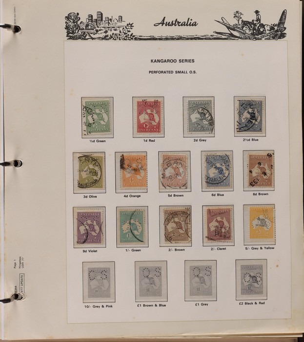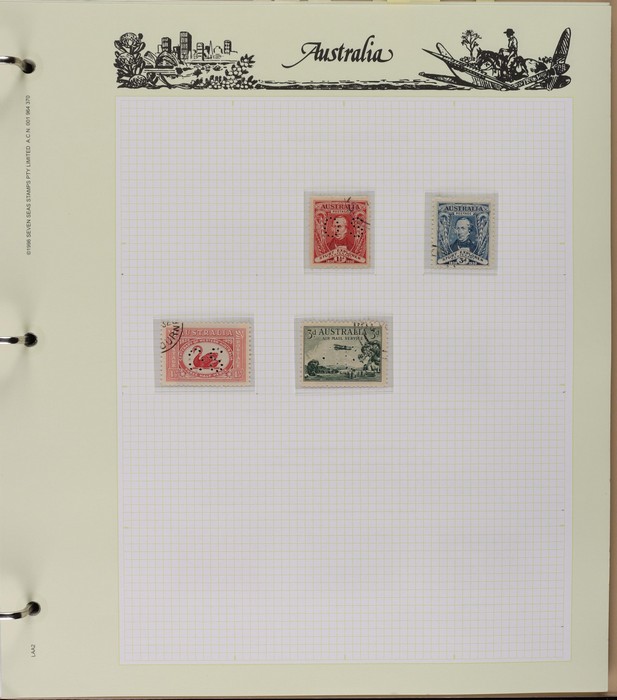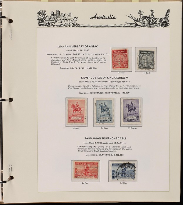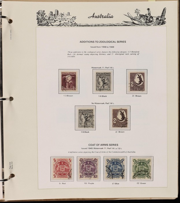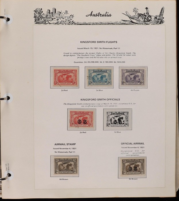 380 image1913-65 collection in Seven Seas illustrated album with Kangaroos (26) to 5/- inc 6d opt OS, plus Large OS perfin to 1/- (ex 2½d) cat $675 inc scarce 5d brown & 9d violet. Small OS perfin set of 14 to 5/- (cat $900) & perf OS/NSW (10) to 1/- ($350). KGV (55) inc CofA wmk set to 1/4 & all OS opts. 1914 Kookaburra 6d Engraved W/C light pmk. 1931 Kingsford Smith set (2) inc OS opts. 1932 Lyrebird 1/- opt OS. 1934 VIC Cent to 1/- (2 sets), plus Macarthur set to 9d. 1935 ANZAC 1/-, plus KGV Silver Jubilee set to 2/-. 1937 Robes set to £1 & 1949 Arms to £2 G-FU & other KGVI issues to 2/6 mixed M & U. 1953-66 QEII Defs & Commems mostly F-VF MNH inc 1959 Pics to 5/- Cattle cream paper, 1964 Navigators to 10/-, 1964 Birds set of 8 to 3/-, 1966 1st decimal set MNH to $4 King. An useful G-VFU/MNH collection, cat/retail $3300. (415) (Image1) (Image2) (Image3) (Image4) (Image5) (Image6) (Image7) (Image8) (Image9) (Image10) (Image11) (Image12) (Image13) (Image14) (Image15) (Image16) (Image17) (Image18)