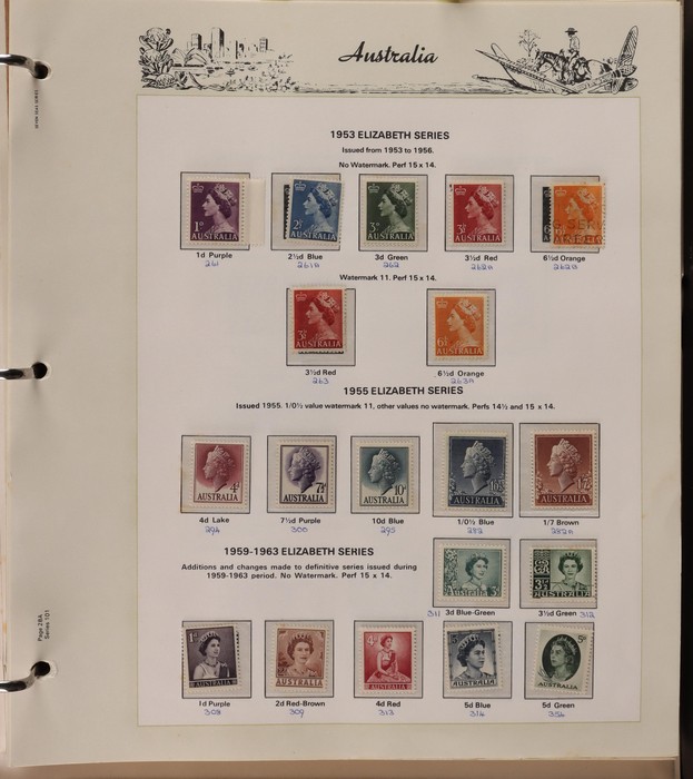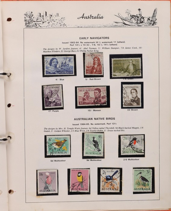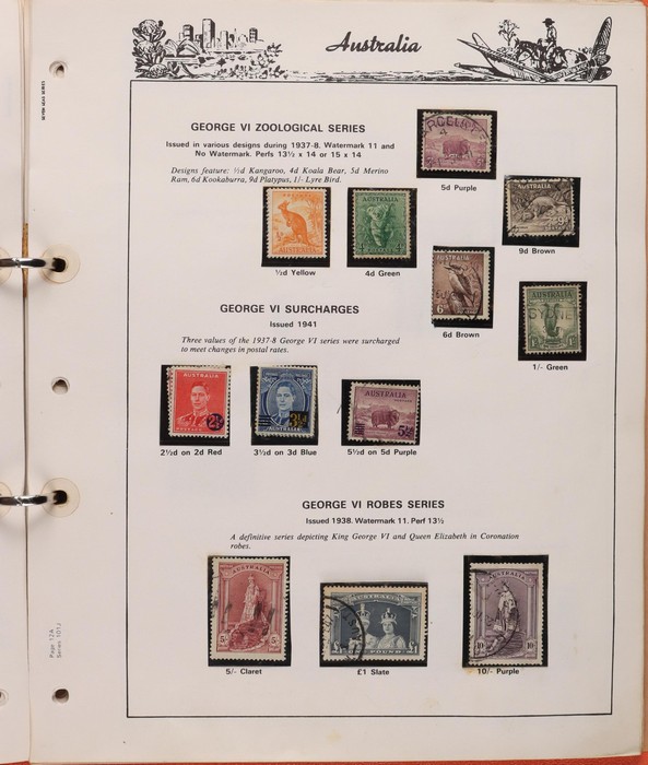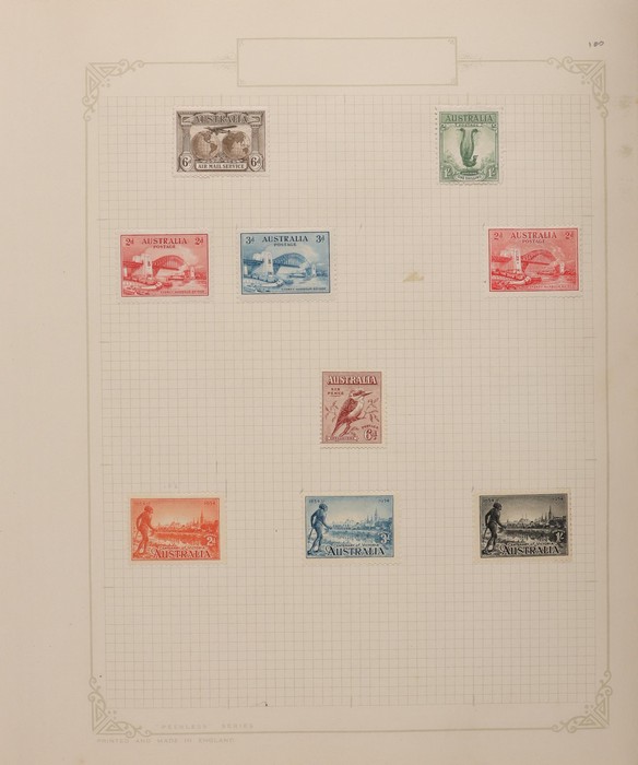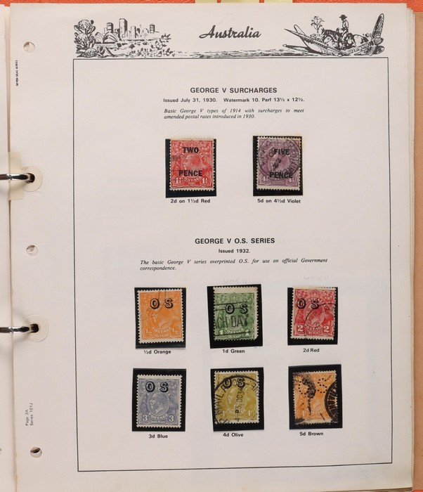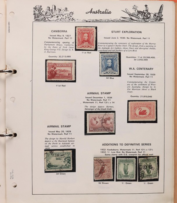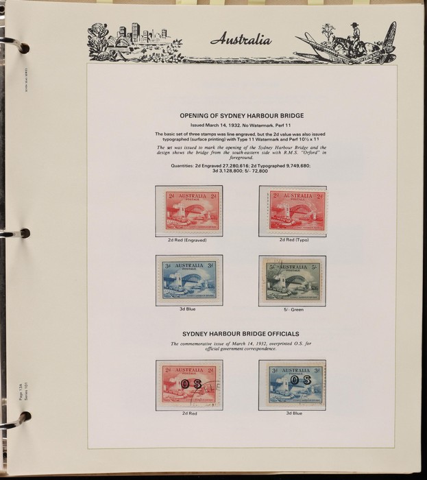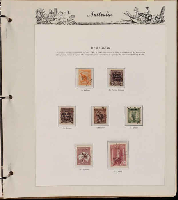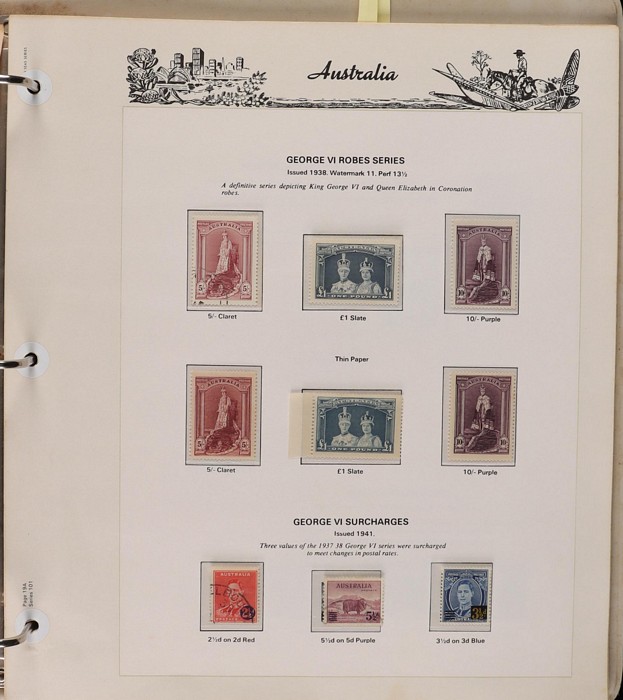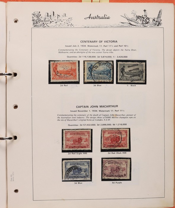 380 image1913-65 collection in Seven Seas illustrated album with Kangaroos (26) to 5/- inc 6d opt OS, plus Large OS perfin to 1/- (ex 2½d) cat $675 inc scarce 5d brown & 9d violet. Small OS perfin set of 14 to 5/- (cat $900) & perf OS/NSW (10) to 1/- ($350). KGV (55) inc CofA wmk set to 1/4 & all OS opts. 1914 Kookaburra 6d Engraved W/C light pmk. 1931 Kingsford Smith set (2) inc OS opts. 1932 Lyrebird 1/- opt OS. 1934 VIC Cent to 1/- (2 sets), plus Macarthur set to 9d. 1935 ANZAC 1/-, plus KGV Silver Jubilee set to 2/-. 1937 Robes set to £1 & 1949 Arms to £2 G-FU & other KGVI issues to 2/6 mixed M & U. 1953-66 QEII Defs & Commems mostly F-VF MNH inc 1959 Pics to 5/- Cattle cream paper, 1964 Navigators to 10/-, 1964 Birds set of 8 to 3/-, 1966 1st decimal set MNH to $4 King. An useful G-VFU/MNH collection, cat/retail $3300. (415) (Image1) (Image2) (Image3) (Image4) (Image5) (Image6) (Image7) (Image8) (Image9) (Image10) (Image11) (Image12) (Image13) (Image14) (Image15) (Image16) (Image17) (Image18)