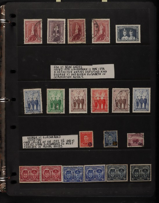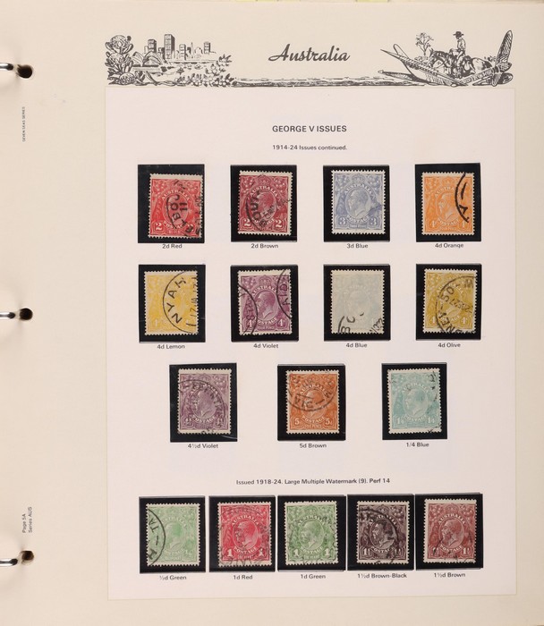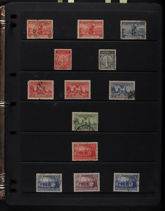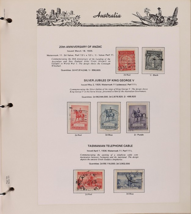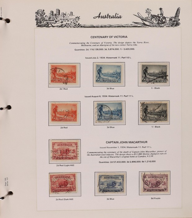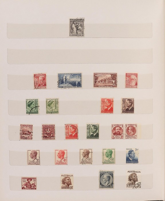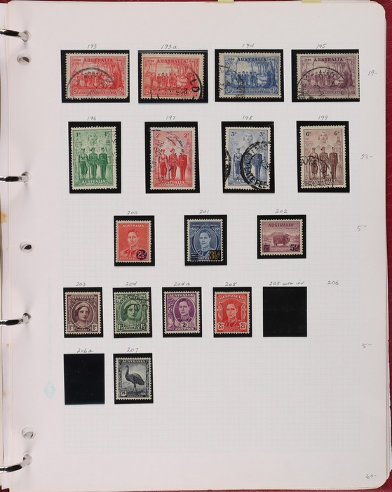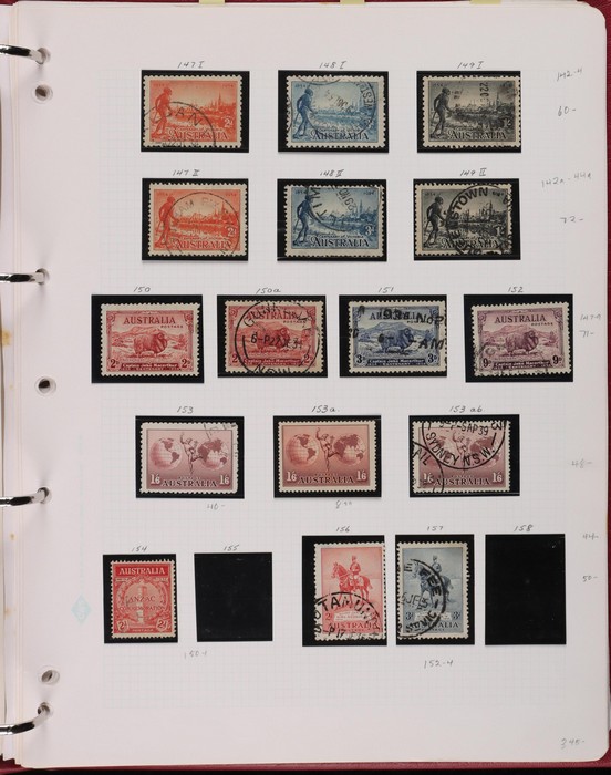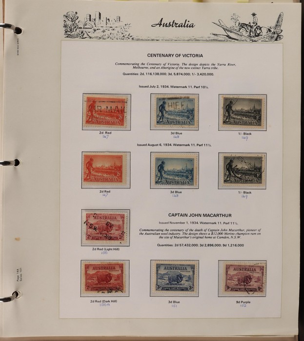 376 image1913-65 Used collection in Seven Seas hingeless album with Kangaroos 1st wmk set to 2/- brown inc 5d CTO Melbourne, 2nd wmk 2d, 6d & 1/-, 3rd wmk set to 2/- maroon, SM to 2/-, plus 6d chestnut opt OS & CofA to 5/- inc 6d opt OS. Total ACSC cat $1200. KGV (58) with 1st wmk to 1/4 inc 1d red Dies II & III, 4d lemon & 4d blue. LM wmk 1d carmine, SM wmk to 1/4 inc 4½d Die II, CofA wmk set & OS opts to 5d brown. Odd CTO, mostly F-VF U, cat $700. 1914 Kookaburra 6d Engraved VFU, 1931 Kingsford Smith set to 6d brown, plus 2d & 6d opt OS. 1932 Bridge 2d, 3d & Lyrebird 1/- all opt OS. 1934 VIC Centenary sets to 1/- (both), 1935 ANZAC 1/- & KGV Silver Jubilee set to 2/- UN. 1937 KGVI set of 22 inc Robes 5/-, 10/-, £1 thick & thin papers UN, cat $280 as M. 1949 Arms set F-VFU. Pre-dec QEII comp inc 1959 Pics to 5/- Cattle, white paper, 1964 Navigator set of 8 to £2 & all high val Commems. A solid G-F/VFU collection, total cat val $3000. (P) (Image1) (Image2) (Image3) (Image4) (Image5) (Image6) (Image7) (Image8) (Image9) (Image10) (Image11) (Image12) (Image13) (Image14) (Image15) (Image16) (Image17)