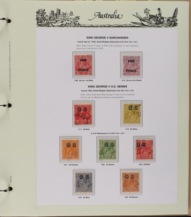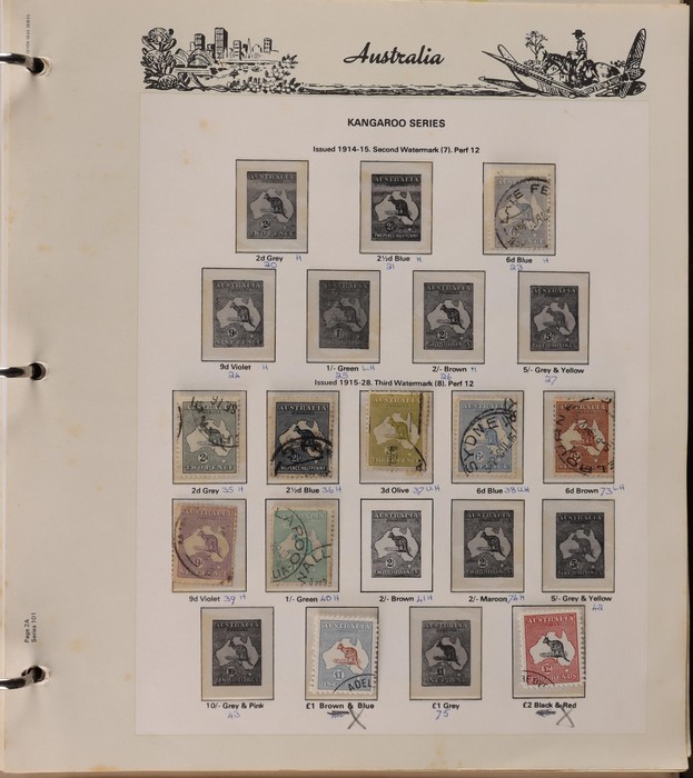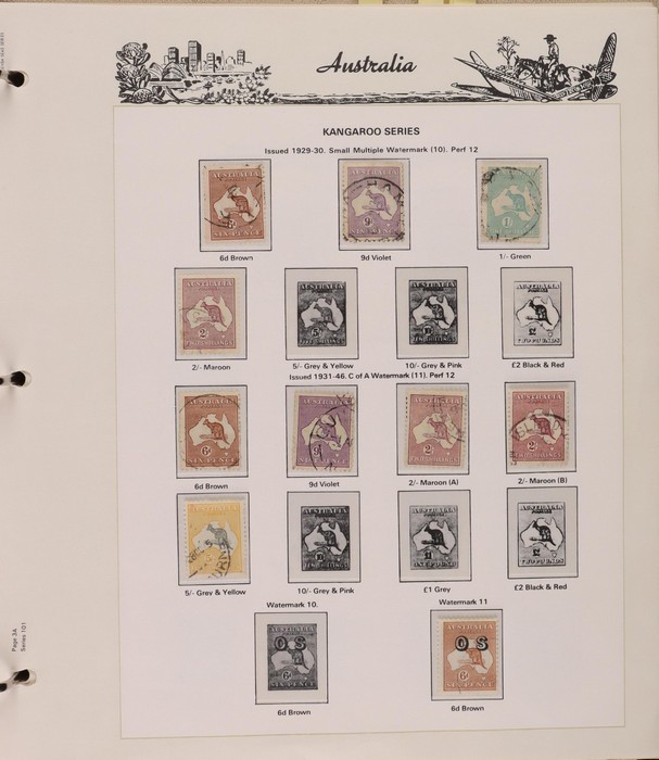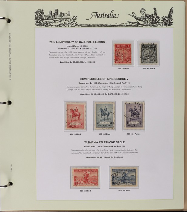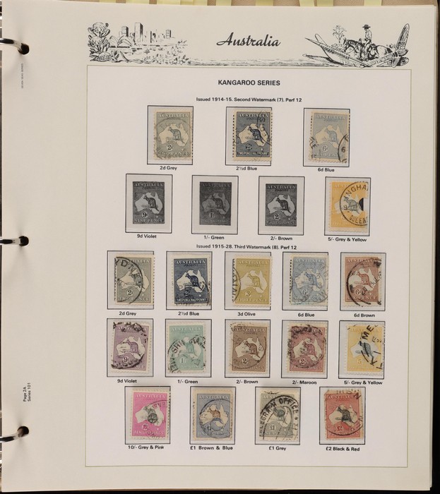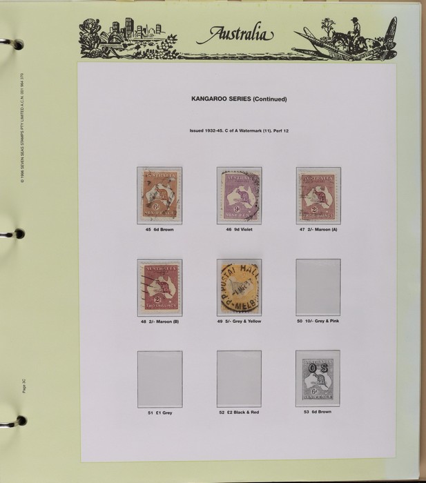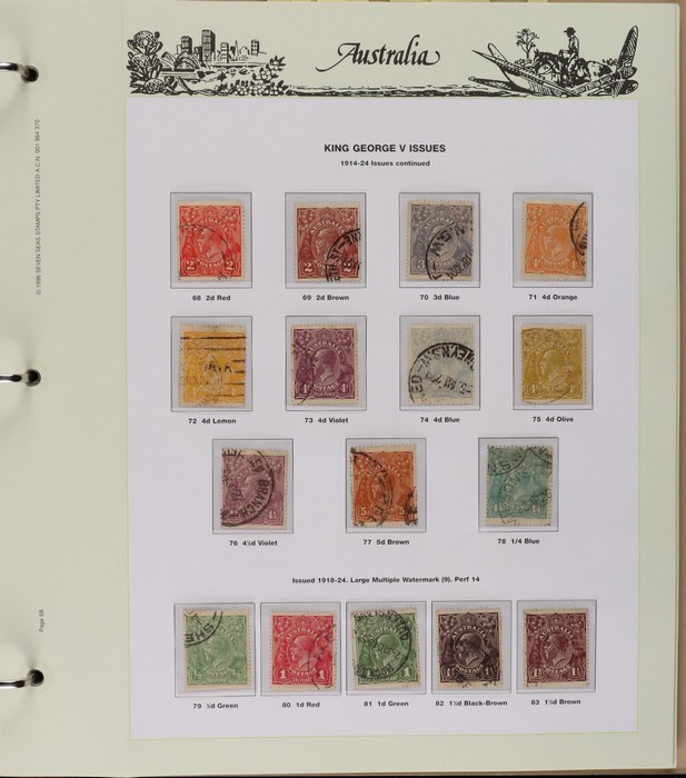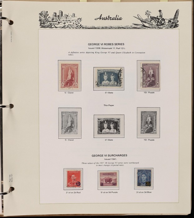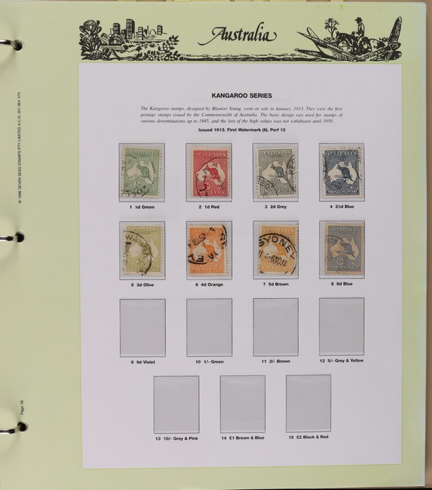 382 image1913-65 Used collection on older style Seven Seas illustrated pgs with Kangaroos (30) inc 1st wmk to 6d. 2nd wmk 2d, 2½d, 6d. 3rd wmk to 2/- plus 5/-, 10/- Telegraph Punctures, SM & CofA wmks to 2/- plus 6d opt OS. KGV set of 72 (retail $750) inc single wmk 1d Die III & 4d lemon, SM wmk perf 14 set of 8 to 1/4, perf 13½x12½ to 1/4 inc 1d Die II & 4½d Die II, CofA to 1/4 & all OS opts. 1914 Kookaburra 6d U & 1928 Kookaburra 3d M/Sheet M (thinned at top). 1931-32 OS opt set of 6 to 1/- Lyrebird plus all 1930s Commems inc Bridge 5/- green & KGV SJ set to 2/-. 1937 KGVI to 1/4 inc 3d blue Die 1A. 1938 Robes sets to £1 (2), 1946 BCOF opt set of 7 to 5/-, 1949 Arms set to £2 & comprehensive QEII inc 1964 Navigator set of 6 to £2 King. Some slightly heavier cancels, generally F-VFU, retail $3000+. (385) (P) (Image1) (Image2) (Image3) (Image4) (Image5) (Image6) (Image7) (Image8) (Image9) (Image10) (Image11) (Image12) (Image13) (Image14)