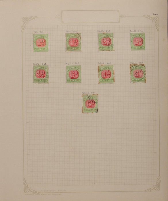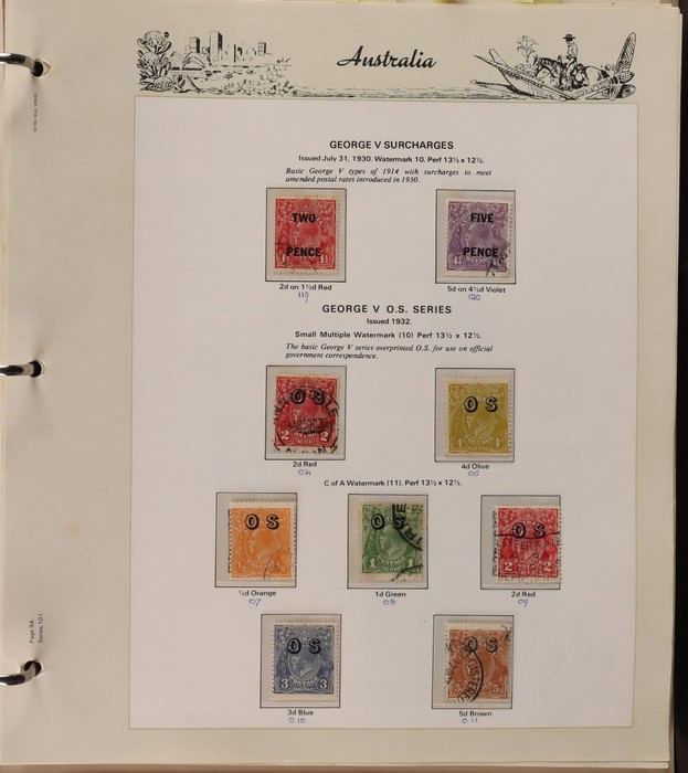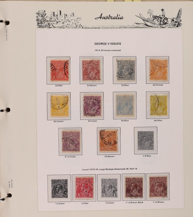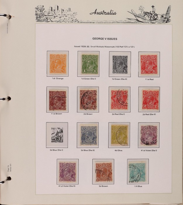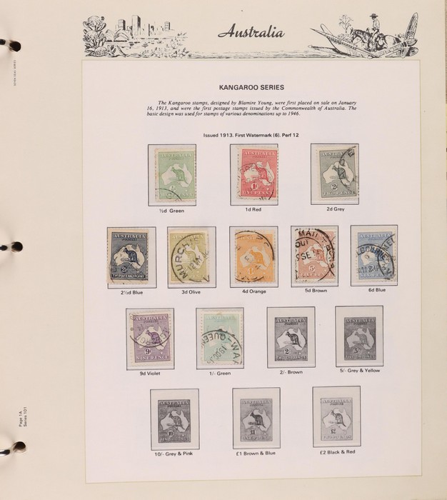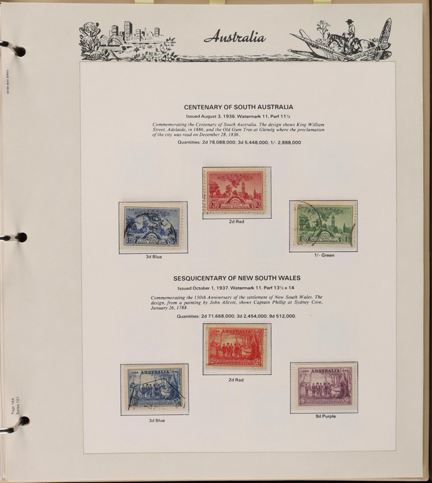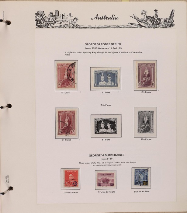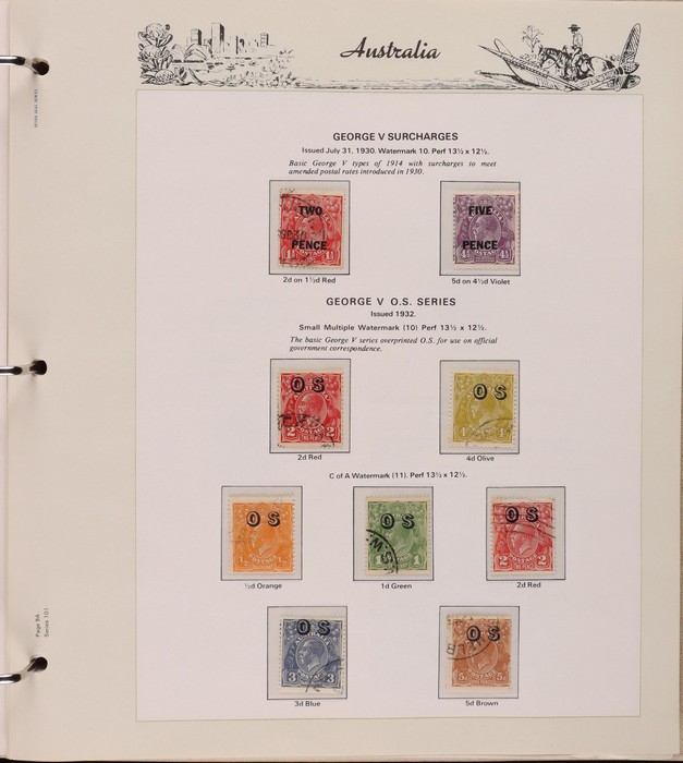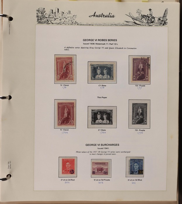 382 image1913-65 Used collection on older style Seven Seas illustrated pgs with Kangaroos (30) inc 1st wmk to 6d. 2nd wmk 2d, 2½d, 6d. 3rd wmk to 2/- plus 5/-, 10/- Telegraph Punctures, SM & CofA wmks to 2/- plus 6d opt OS. KGV set of 72 (retail $750) inc single wmk 1d Die III & 4d lemon, SM wmk perf 14 set of 8 to 1/4, perf 13½x12½ to 1/4 inc 1d Die II & 4½d Die II, CofA to 1/4 & all OS opts. 1914 Kookaburra 6d U & 1928 Kookaburra 3d M/Sheet M (thinned at top). 1931-32 OS opt set of 6 to 1/- Lyrebird plus all 1930s Commems inc Bridge 5/- green & KGV SJ set to 2/-. 1937 KGVI to 1/4 inc 3d blue Die 1A. 1938 Robes sets to £1 (2), 1946 BCOF opt set of 7 to 5/-, 1949 Arms set to £2 & comprehensive QEII inc 1964 Navigator set of 6 to £2 King. Some slightly heavier cancels, generally F-VFU, retail $3000+. (385) (P) (Image1) (Image2) (Image3) (Image4) (Image5) (Image6) (Image7) (Image8) (Image9) (Image10) (Image11) (Image12) (Image13) (Image14)