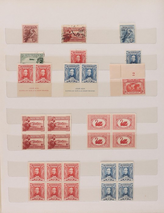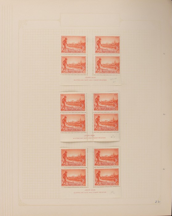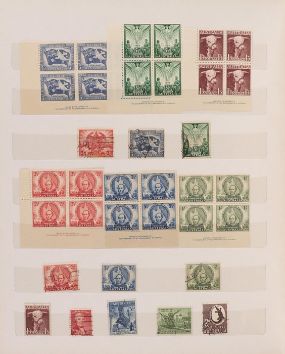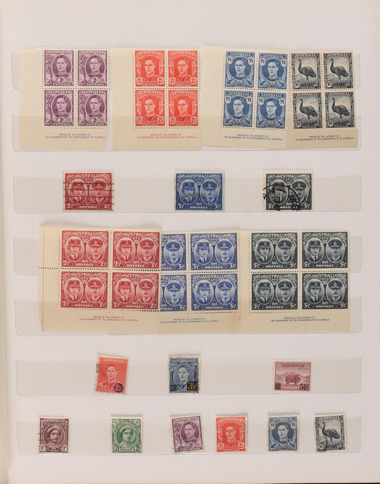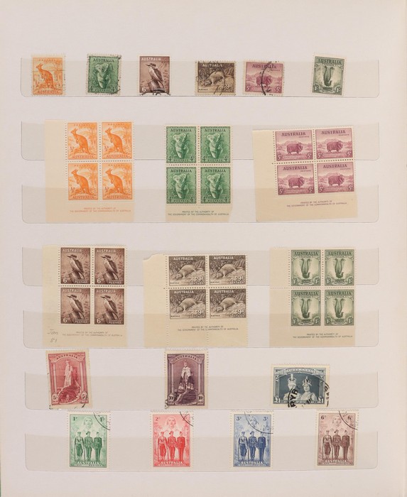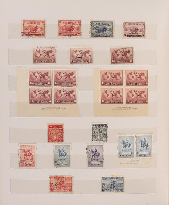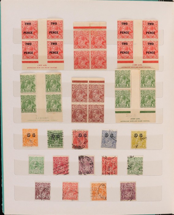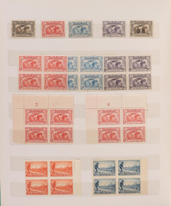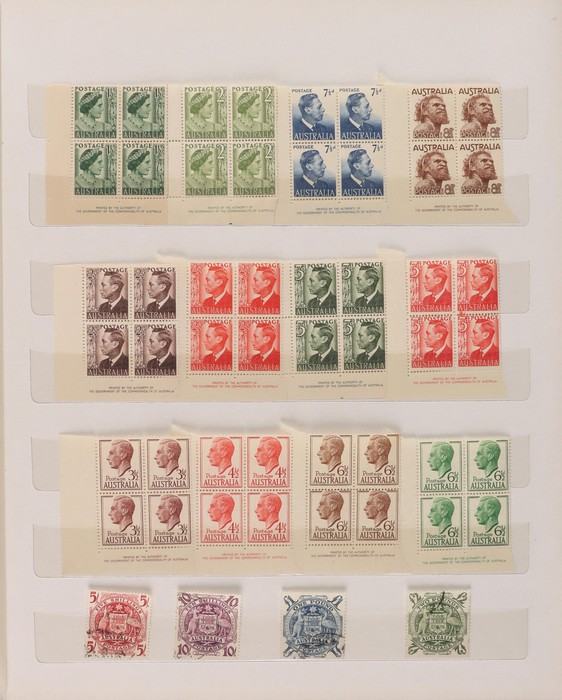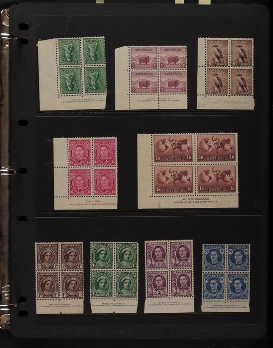381 image1913-65 collection in s/book with Kangaroos (24) inc 2/- blks of 4 (3), KGV (80) inc basic sets to 1/4 plus OS perfins to 5d U & 1d green Mullett (cat $250) or Ash ($175) imprint blks of 4 M. 1914 Kookaburra 6d Engraved VFU. 1930 Sturt set blks of 4 M/MNH plus Ash imprint prs. 1931 Kingsford Smith trio blks of 4 MNH. 1934 VIC Cent 2d, 3d marginal MNH blks of 4 plus set to 1/- FU. 1934 Macarthur to 9d, 1935 ANZAC 1/- & KGV SJ sets U. 1937 Airmail 1/6 claret Hermes McCracken imprint blks of 4 MLH (2, ACSC cat $100). 1937 KGVI Def set to £1 Robes U & 1942 Zoological Authority imprint set of 6. Other imprint blks (39) inc 1940s Commems, 1947 1d Princess flush perf blk of 20 (cat $90) & 1952 KGVI Defs to 6½d green. Then 1950s & 60s QEII Commem MNH positional multiples inc cnr blks of 4 & QEII 5d red booklet panes (2, cat $100). Also Used sets/singles inc 1963 Navigators to £1 & 1947 Arms to £2. Bit messy in places, mostly MNH plus F-VFU. ACSC cat $2800. (950) (Image1) (Image2) (Image3) (Image4) (Image5) (Image6) (Image7) (Image8) (Image9) (Image10) (Image11) (Image12) (Image13) (Image14) (Image15) (Image16) (Image17)
