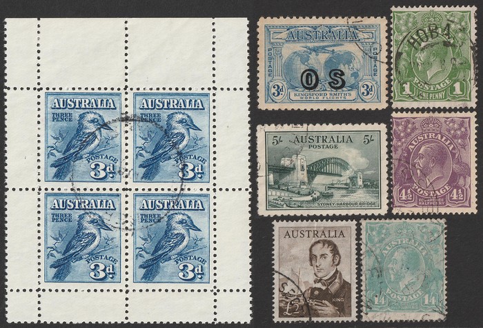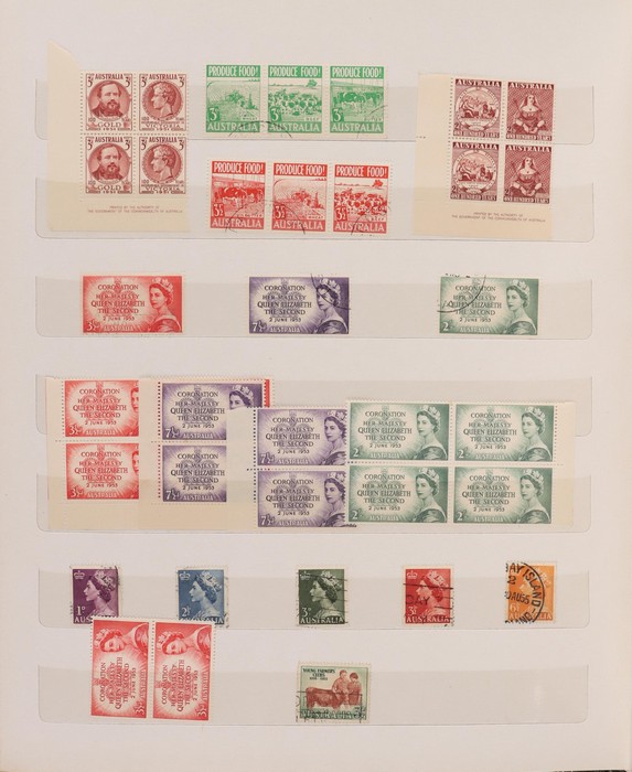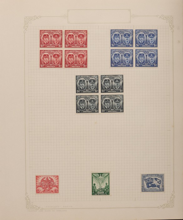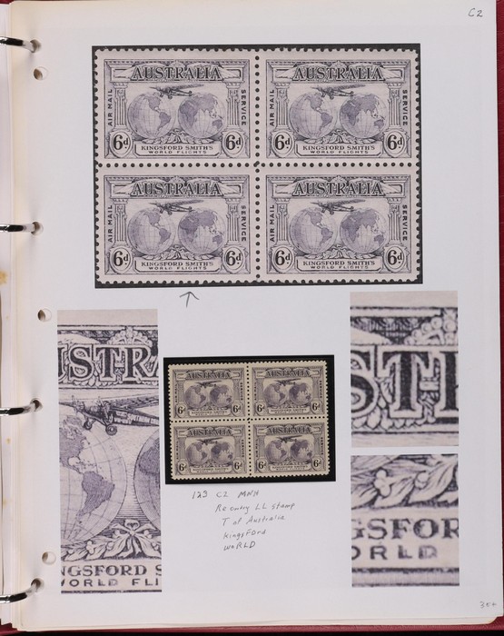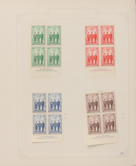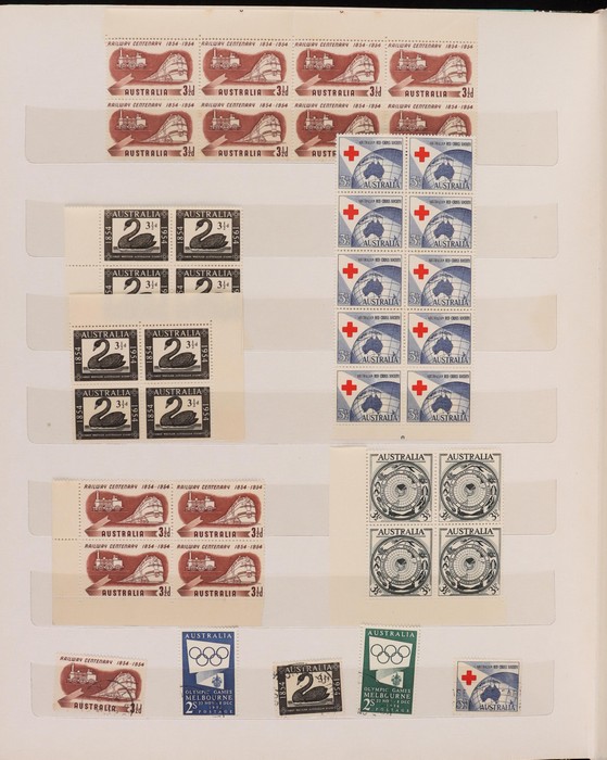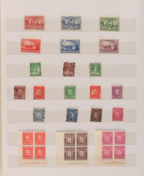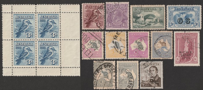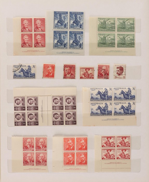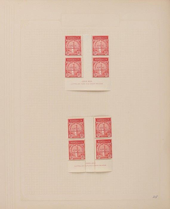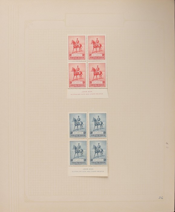 381 image1913-65 collection in s/book with Kangaroos (24) inc 2/- blks of 4 (3), KGV (80) inc basic sets to 1/4 plus OS perfins to 5d U & 1d green Mullett (cat $250) or Ash ($175) imprint blks of 4 M. 1914 Kookaburra 6d Engraved VFU. 1930 Sturt set blks of 4 M/MNH plus Ash imprint prs. 1931 Kingsford Smith trio blks of 4 MNH. 1934 VIC Cent 2d, 3d marginal MNH blks of 4 plus set to 1/- FU. 1934 Macarthur to 9d, 1935 ANZAC 1/- & KGV SJ sets U. 1937 Airmail 1/6 claret Hermes McCracken imprint blks of 4 MLH (2, ACSC cat $100). 1937 KGVI Def set to £1 Robes U & 1942 Zoological Authority imprint set of 6. Other imprint blks (39) inc 1940s Commems, 1947 1d Princess flush perf blk of 20 (cat $90) & 1952 KGVI Defs to 6½d green. Then 1950s & 60s QEII Commem MNH positional multiples inc cnr blks of 4 & QEII 5d red booklet panes (2, cat $100). Also Used sets/singles inc 1963 Navigators to £1 & 1947 Arms to £2. Bit messy in places, mostly MNH plus F-VFU. ACSC cat $2800. (950) (Image1) (Image2) (Image3) (Image4) (Image5) (Image6) (Image7) (Image8) (Image9) (Image10) (Image11) (Image12) (Image13) (Image14) (Image15) (Image16) (Image17)