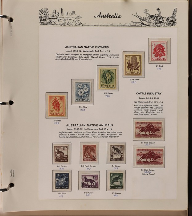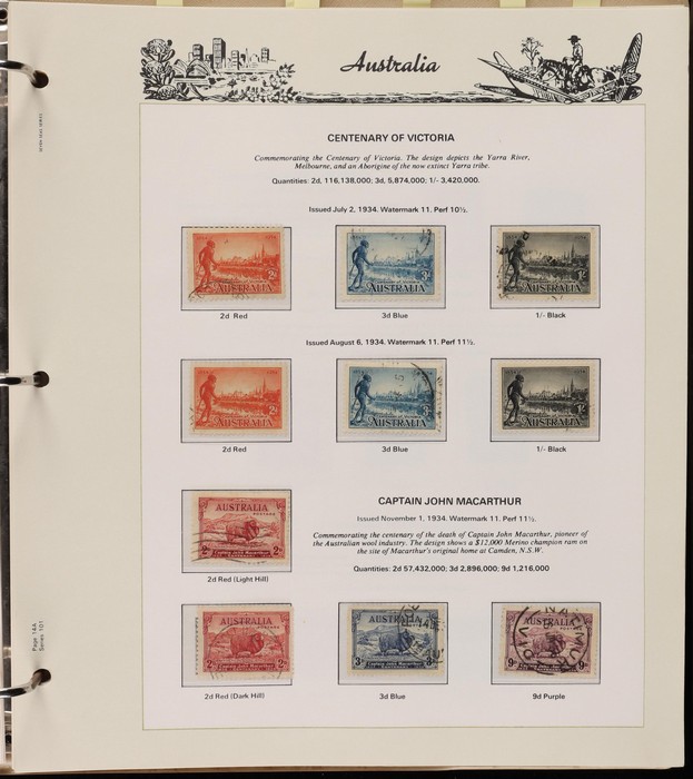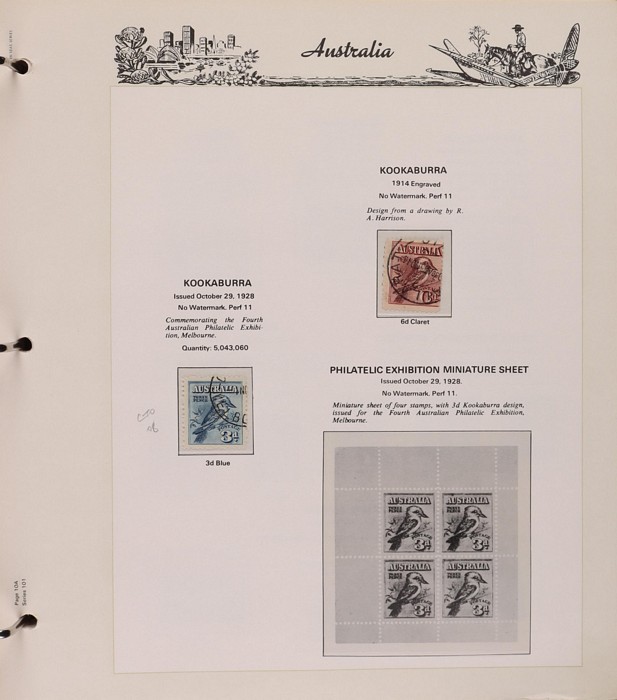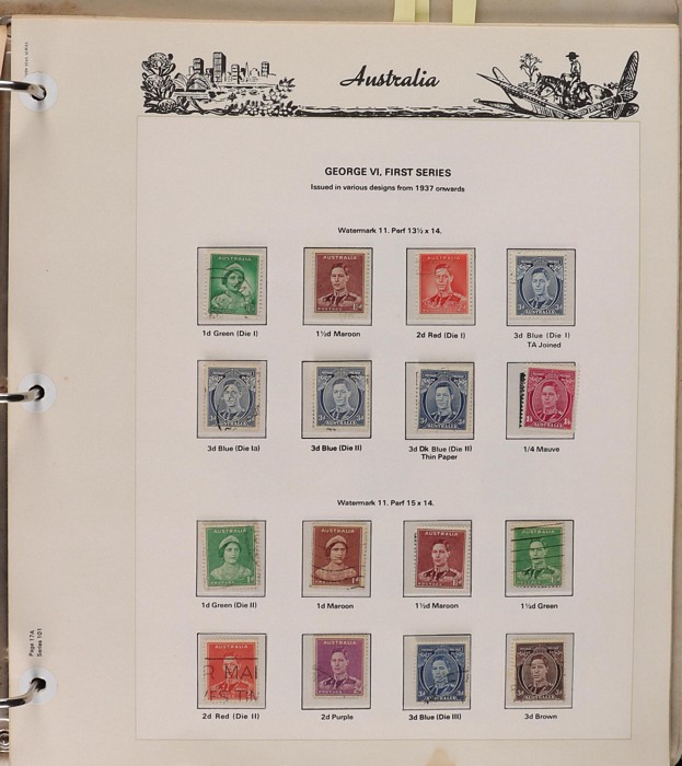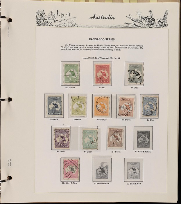 373 image1913-65 MNH/M/U collection in Seven Seas album with Kangaroos 1st wmk to 1/-, 2nd to 2/-, 3rd to 5/-, SM wmk to 2/- & CofA to 10/- plus £1 grey Telegraph Puncture, all G-FU. KGV set of 72 inc 1d red Die II, Die II, 1d green Die I-II pr, 4½d Die II & OS opt to 5d brown F-VFU plus perf OS near comp (51) with single wmk to 1/4, no wmk 1d & 1½d, SM wmk perf 14, 2d, 4d, 4½d & 1/4. SM wmk perf 13½x12½ (12) to 1/4, G-FU inc odd CTO (ACSC cat $1500). 1914 Kookaburra 6d Engraved CTO, 1927-30 Commems set of 6 perf OS, 1928 Kookaburra 3d M/sheet M (2 small rev thins). 1931-37 Commems & Pics F-VFU with OS opt set of 6 to 1/- Lyrebird set (5/- small rev thin). 1934 VIC Cent & Macarthur sets, 1935 ANZAC 1/- & KGV SJ to 2/-, 1936 SA & 1937 NSW Sesqui set. KGVI 1937-50 near comp M inc 3d blue 'white wattles' Robes set to £1 plus 10/- opt SPECIMEN. 1940 AIF set & 1949 Arms set to £2. 1951-65 Pics, Defs & Commems comp inc 1950 KGVI Defs to 2/6, 1959-61 Pics to 5/- Cattle white paper, 1964 Navigators set of 8 to £2 & 1964 Birds to 3/-. MNH/M/U as noted, ACSC cat $6850 plus extra for £1 Kangaroo. (450) (P) (Image1) (Image2) (Image3) (Image4) (Image5) (Image6) (Image7) (Image8) (Image9) (Image10) (Image11) (Image12) (Image13) (Image14) (Image15) (Image16) (Image17) (Image18) (Image19) (Image20) (Image21) (Image22) (Image23) (Image24) (Image25) (Image26) (Image27)