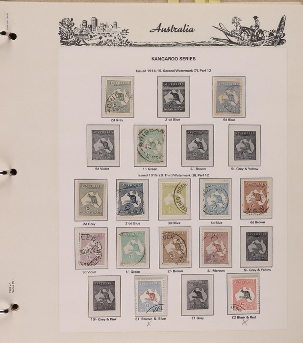 374 image1913-65 Used collection in Seven Seas hingeless album with Kangaroos (36) inc 1st wmk to 9d, 3rd wmk to 2/-, CofA wmk to 10/- plus 6d opt OS & £1, £2 'Replicas'. KGV near comp set to 1/4 inc 1d red Die III, 1d green Die II, 4d lemon, 4½d Die II & all OS opts. 1914 Kookaburra 6d Engraved CTO, 1931 Kingsford Smith 2d, 3d opt OS, 1934 VIC Cent & Macarthur sets, 1935 ANZAC 1/- & KGV SJ to 2/-. 1938 KGVI to £1 Robes, 1949 Arms to £2 green & comprehensive QEII pre-decimals to £2 King. Odd heavier pmk during KGV era, F-VFU, retail $2000+. (290) (P) (Image1) (Image2) (Image3) (Image4) (Image5) (Image6) (Image7) (Image8) (Image9) (Image10) (Image11) (Image12) (Image13) (Image14) (Image15) (Image16) (Image17) (Image18) (Image19)