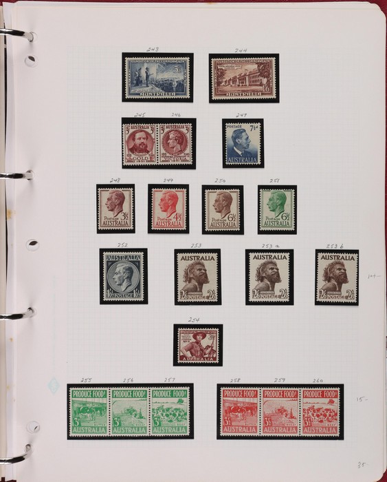 370 image1913-65 pre-decimal collection on Seven Seas pages inc Roo 1st wmk to 1/-, 3rd wmk to 5/-, CofA wmk to 10/-, KGV single wmk comp to 1/4 inc 4d lemon-yellow, SM wmk perf 14 to 1/4, SM perf 13½x12½ comp to 1/4, CofA wmk comp to 1/4 (2), 1914 6d Engraved Kookaburra, 1932 Kingsford Smith set inc opt OS, KGV/KGVI Commems comp inc Macarthur, ANZAC, Silver Jubilee etc, 1937 KGVI Defs inc 3d blue Die I, 1937 Robes to £1 (2 sets), Arms comp to £2, Navigators to 10/-. Some perf OS inc 2d grey 1st wmk large OS. Album some toning. Few faults in earlies, mostly F-VF M/MNH/U. ACSC cat $3100. (500) (Image1) (Image2) (Image3) (Image4) (Image5) (Image6) (Image7) (Image8) (Image9) (Image10) (Image11) (Image12) (Image13) (Image14)